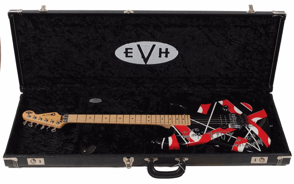 Eddie Van Halen’s gorgeous stage-used right-handed striped Charvel EVH Art Series electric guitar, serial No. 231, signed on the body in silver ink, “Eddie Van Halen, 2007,” adding the date and venue above, “Anaheim, CA, 12.20.07.” Back of guitar bears an affixed EVH authenticity label, “00231.” The instrument was hand-striped by Van Halen himself. Includes its original black EVH hardshell case. In fine condition. Oversized. Accompanied by a color photo of Van Halen playing the guitar on stage, and a certificate of authenticity signed in black ballpoint by Van Halen, indicating that the guitar was played at Anaheim’s Honda Center on December 20, 2007. Oversized.