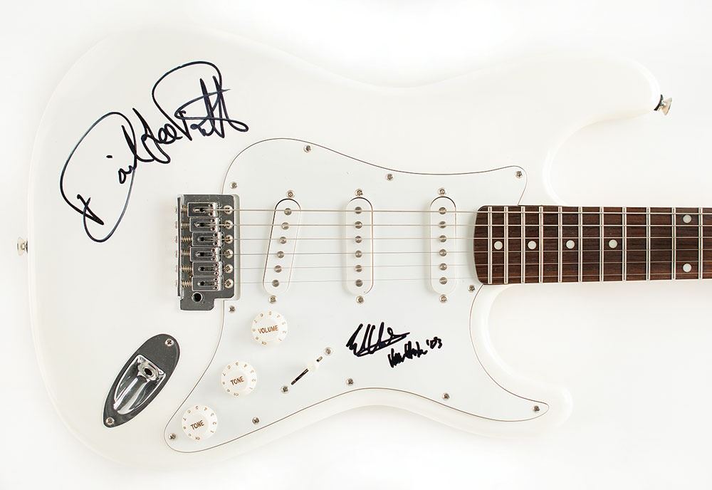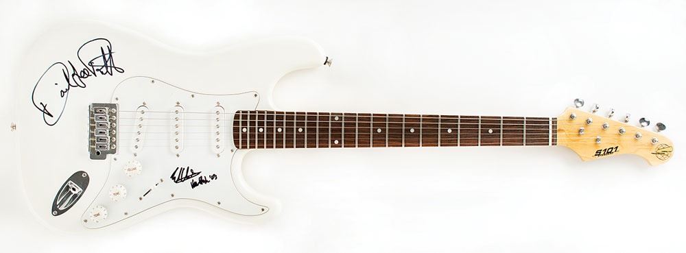 Attractive white-bodied S101 Standard Stratocaster-style electric guitar, signed prominently on the body in black felt tip by David Lee Roth, and on the pickguard by Eddie Van Halen, who adds, "Van Halen, '03." In fine condition. Accompanied by a John Brennan Collection letter of provenance.