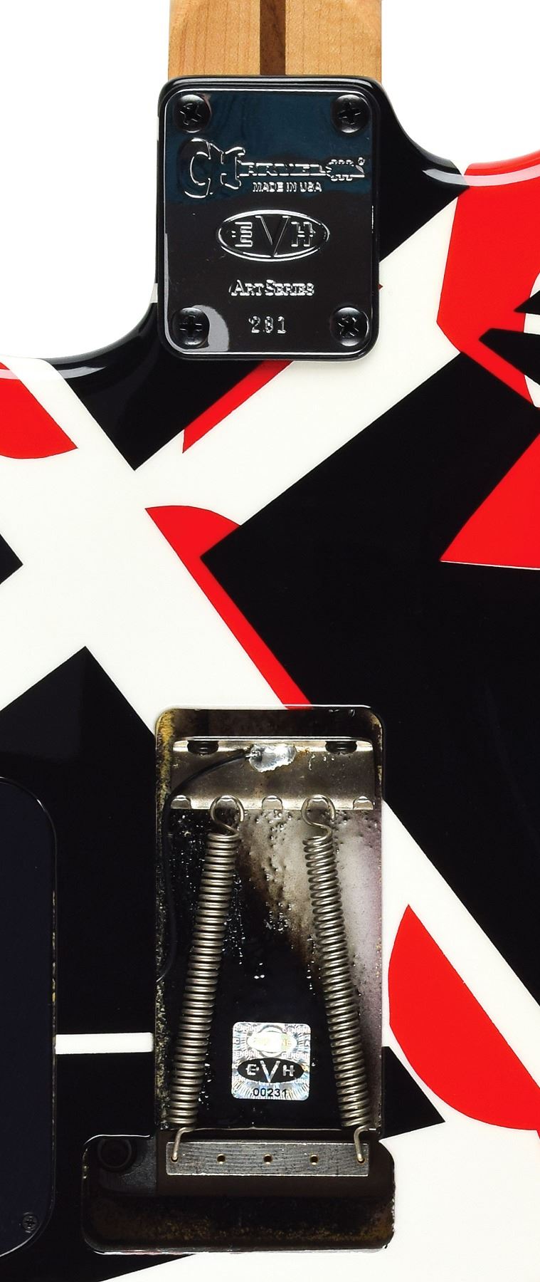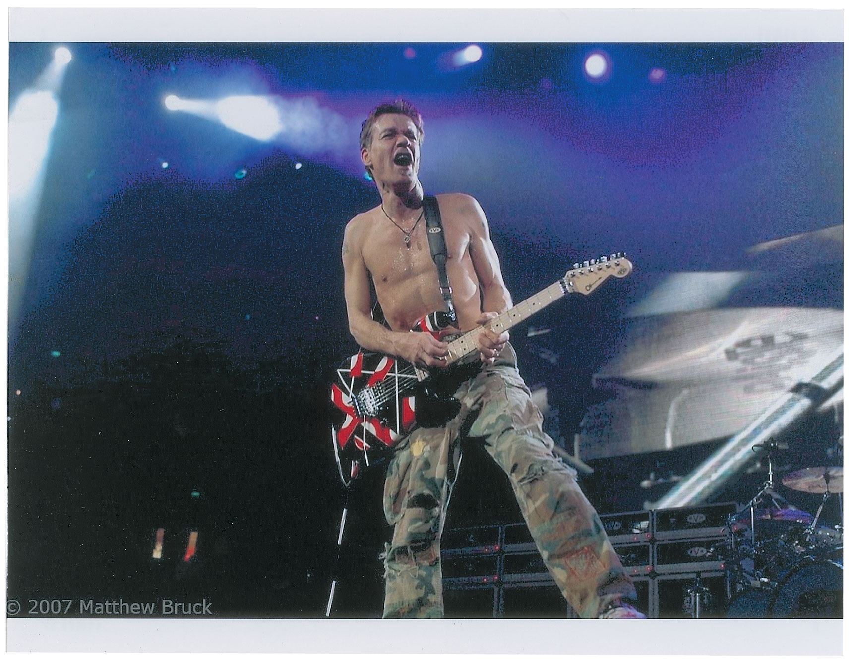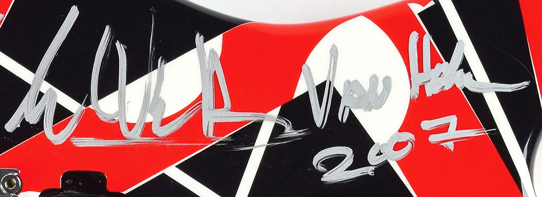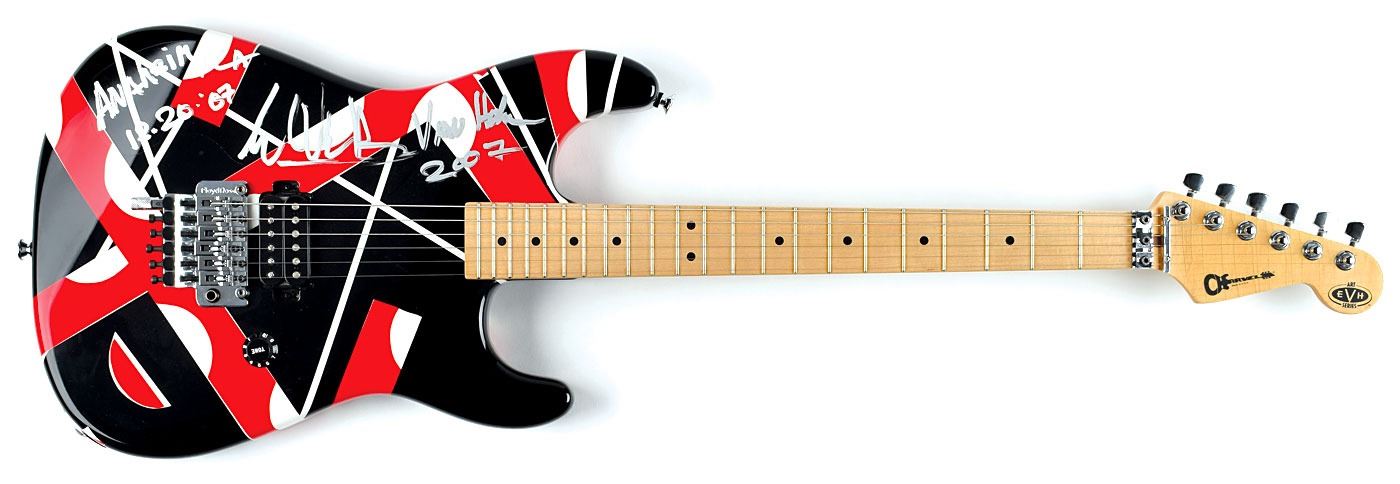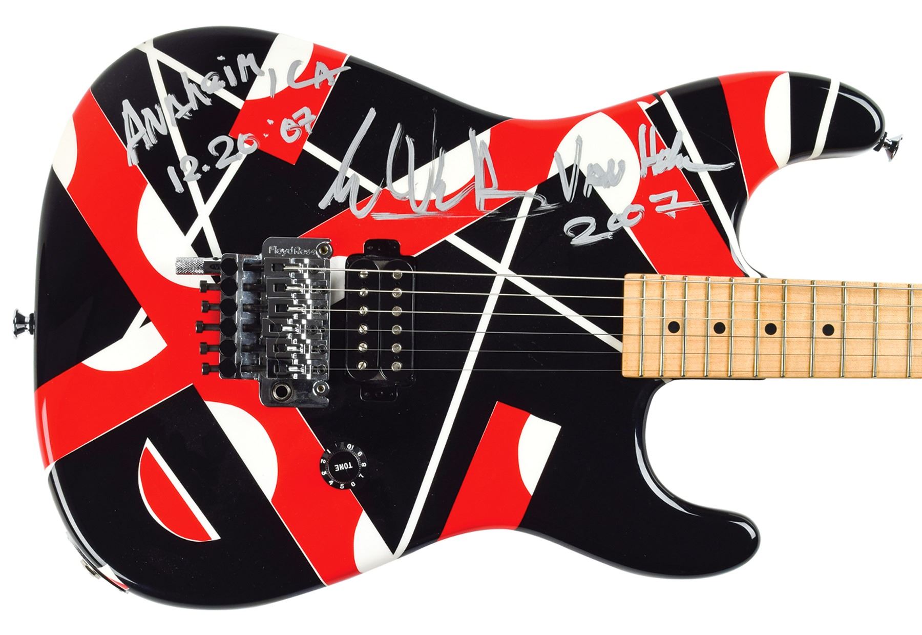 Stage-used Charvel EVH Art Series electric guitar with red, white, and black stripe pattern, played during a Van Halen concert at the Honda Center by Eddie Van Halen, who has signed the body in silver ink, "Anaheim, CA, 12. 20. '07, Eddie Van Halen, 2007." EVH Art Series back plate features an edition number of "231." Includes a handsome custom hardshell carrying case with large "EVH" logo to inner lining. In fine condition. Designed by the master himself, the Charvel EVH Art Series guitar is based on Eddie Van Halen's original Frankenstein guitar, which was the musician's attempt to merge the sound of a classic Gibson guitar with the physical attributes and tremolo bar functionality of a Fender Stratocaster. The striped finish was the result of Van Halen painting the guitar differing colors, applying strips of masking tape after each coat, and then peeling to reveal his Shelleyan monstrosity. Accompanied by a photo of EVH playing the guitar on stage, as well as a certificate of authenticity signed by Van Halen, who affirms that he played guitar "231" on "December 20, 2007; Anaheim, CA."