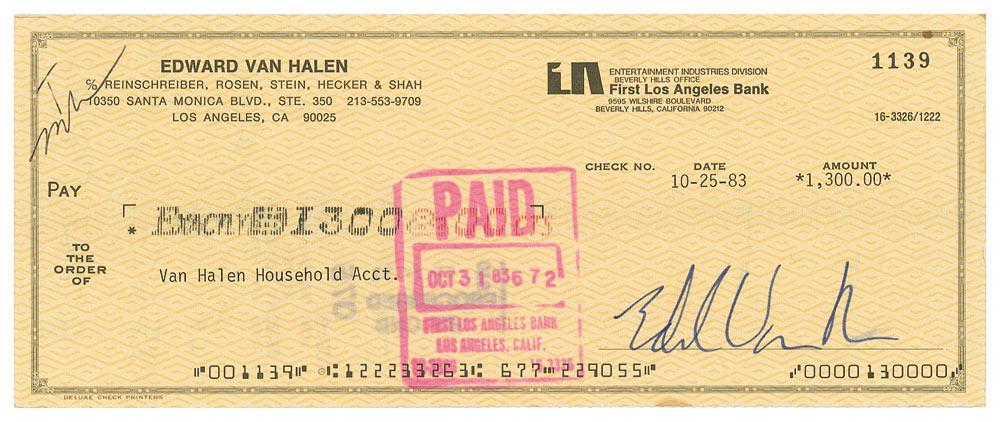 Personal check, 8.25 x 3.25, filled out in type and signed by Van Halen, “Edward Van Halen,” payable to Van Halen Household Acct. for $1300.00, October 25, 1983. In fine condition, with bank stamp to body, a small ink notation, slight brush to last name of signature, and show-through from another stamp on reverse. Accompanied by a letter of authenticity from James Spence.