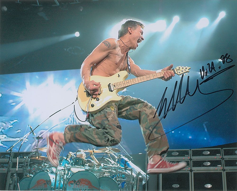 Color satin-finish 10 x 8 photo of Van halen performing one of his patented leaps on stage, signed in black felt tip. In fine condition.