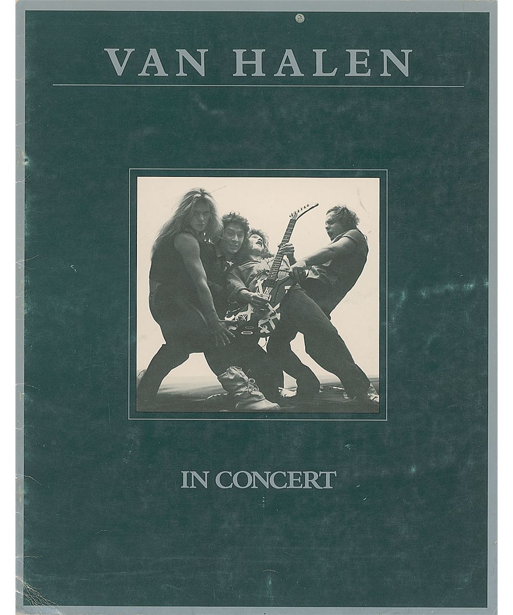 Van Halen 1980 Invasion tour program, 11 x 14, 20 pages, signed on the back cover in red felt tip by Van Halen. A ticket from the band’s August 24, 1980, concert in Salina, Kansas, is taped to the bottom of the back cover. In fine condition, with expected light creases from handling.