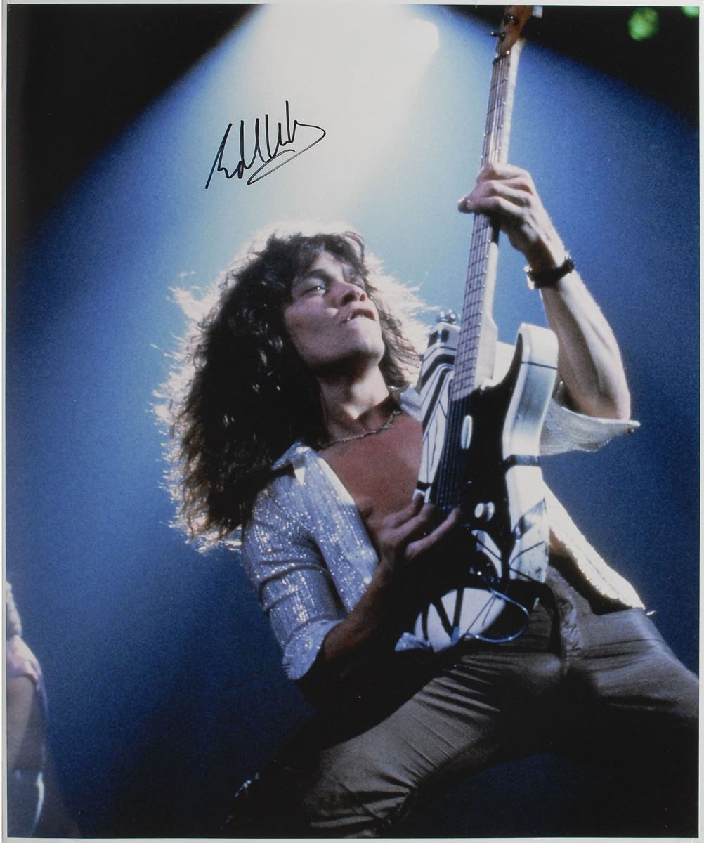 Huge color semi-glossy 16 x 20 photo of a young Eddie Van Halen rocking his guitar during a concert, signed in black felt tip. In fine condition, with a small tear to top edge.