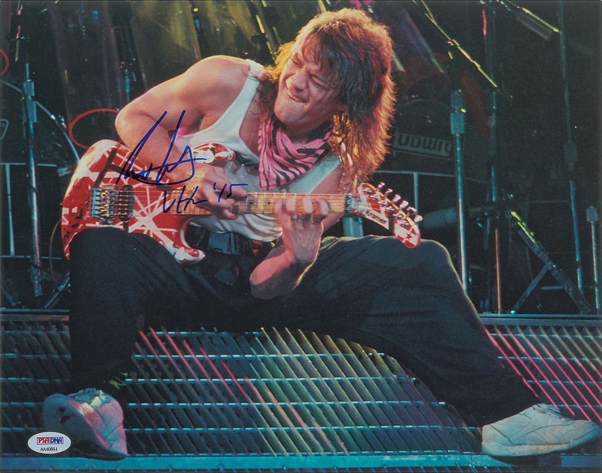 Color glossy 14 x 11 full-length photo of Eddie Van Halen sitting down and performing on stage with his Kramer 5150, signed in blue felt tip, “Eddie Van Halen, VH ‘15.” In fine condition. Accompanied by a certificate of authenticity from PSA/DNA.