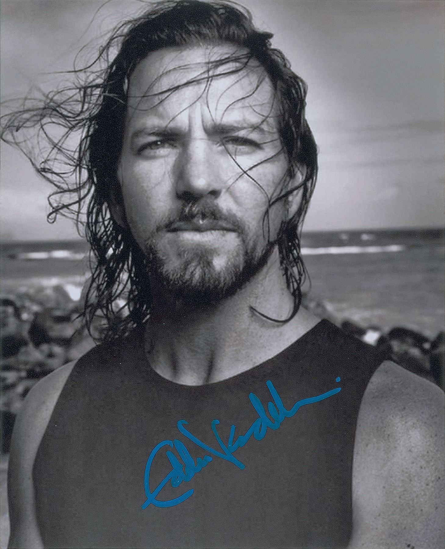 Satin-finish 8 x 10 close-up photo of Eddie Vedder, signed in blue ink. In very fine condition.