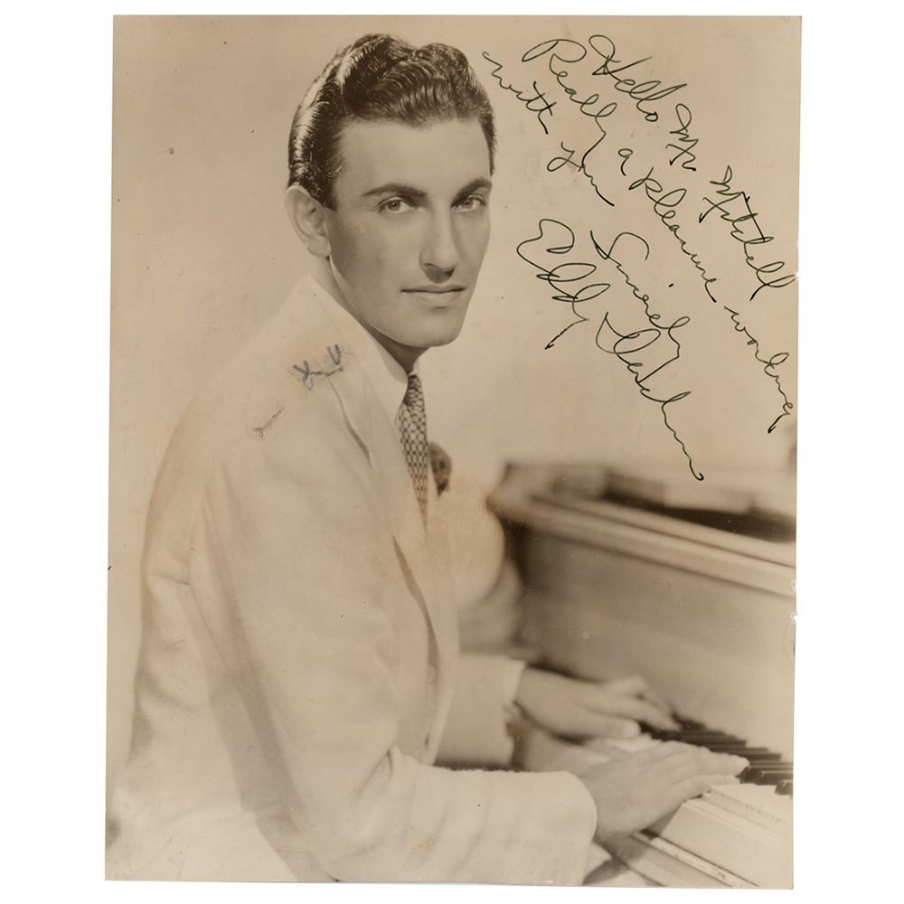 Vintage glossy 7 x 9 photo of Duchin at his piano, signed and inscribed in fountain pen, "Hello Mr. Mitchell, Really a pleasure working with you, Sincerely, Eddy Duchin.†In very good to fine condition, with trimmed edges, and small stains to his lapel.