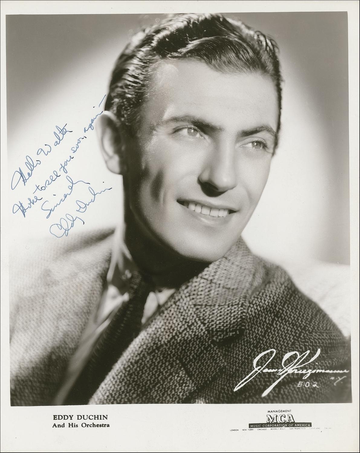 Vintage glossy 8 x 10 portrait, signed and inscribed in fountain pen “Hello Walter, Hope to see you soon, again—Sincerely, Eddy Duchin.” In fine condition with a lower right corner crease.