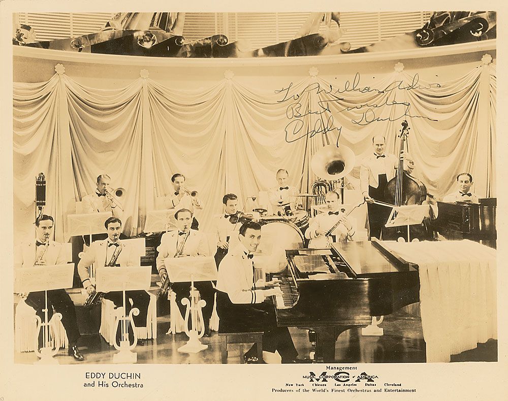 Vintage pearl-finish 10 x 8 MCA publicity photo, signed and inscribed in fountain pen, “To William Adwo, Best wishes, Eddy Duchin.” In fine condition, with a few light creases.