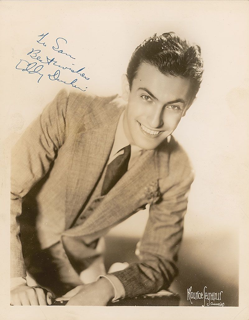 Vintage glossy 8 x 10 Maurice Seymour publicity photo, thoughtfully signed and inscribed in fountain pen against the white background, “To Sam, Best wishes, Eddy Duchin.” In fine condition.