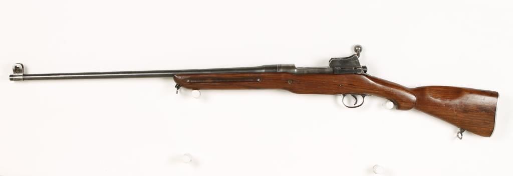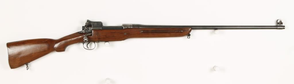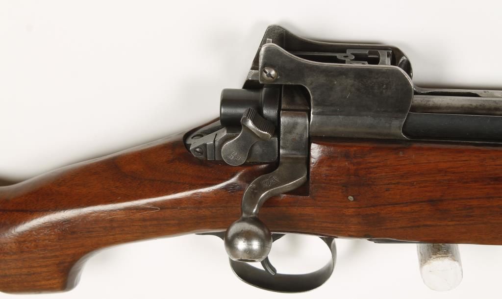 Sporterized bolt action military rifle with 26" barrel. Stock has been cut down and reshaped, maintains original front sight and rear sight. Flaming bomb stamps on barrel, receiver and bolt. Dark bore and good action. Condition: Fair to good as sporterized. *Curio & Relic Firearm*