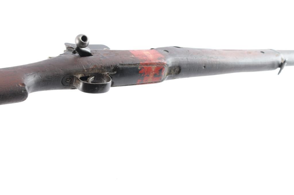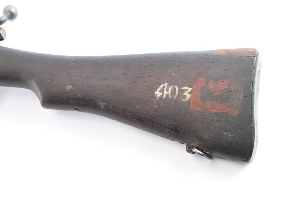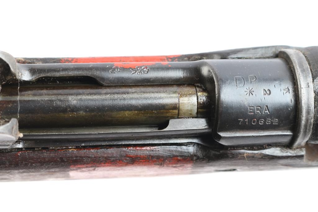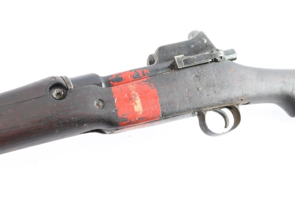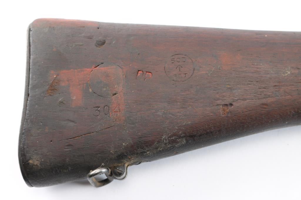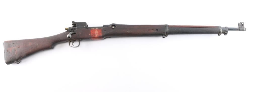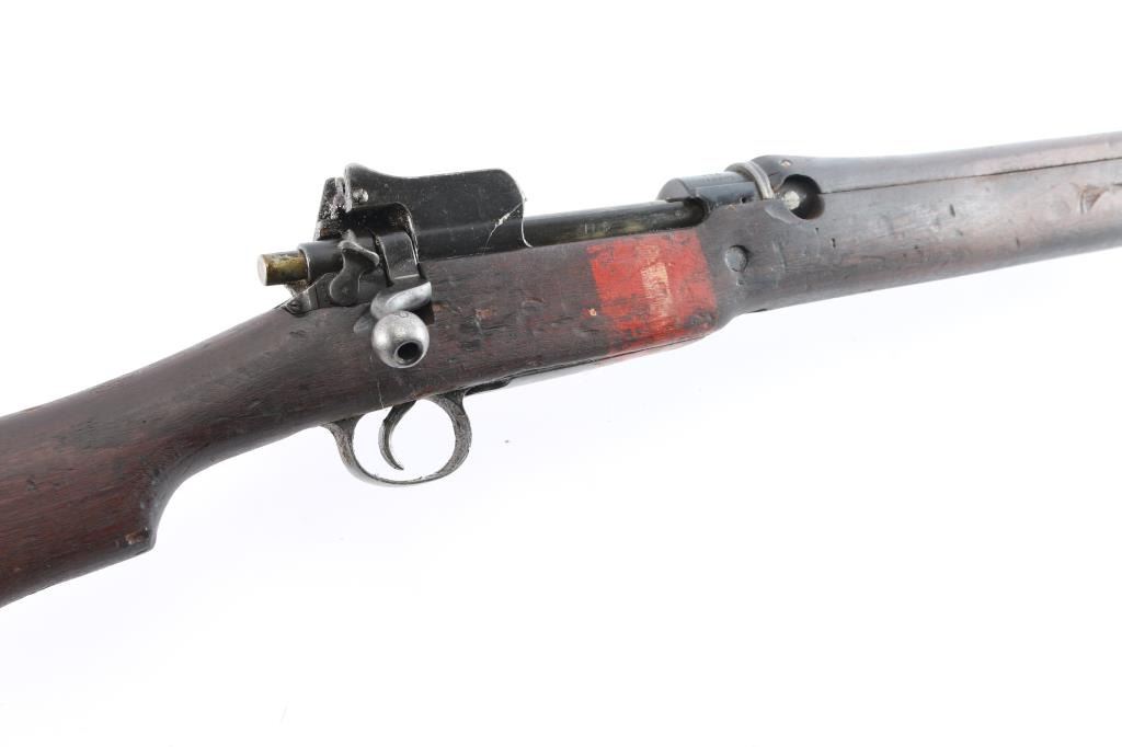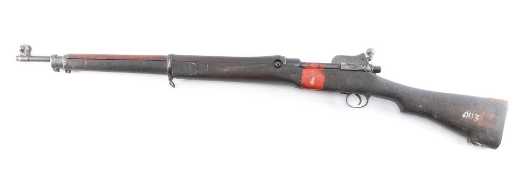 For parts, or repair. A Pattern 14 British military magazine fed bolt action service rifle chambered in .303 British. Manufactured in Eddystone, Pennsylvania by the Remington Arms Company of Delaware circa 1914-1916. Imported by C.A.I, of St. Albans, VT., with import marks on the right side of the barrel. Barrel length is approximately 26 inches with a protected blade front sight, and folding ladder rear aperture sight, manual safety, dog-leg style bolt handle, smooth floorplate, and a smooth metal buttplate with a storage compartment. Converted to "Drill Purpose" by welding a steel bar across the chamber. Red and White stripes painted across action. Bolt and receiver stamped "DP". Stock and handguard have notches cut in chamber area where plug was installed. Volley sights are not present. Metal parts originally blued with approximately 80% remaining and is in overall in good condition. It is missing the stacking swivel. Stock is in good condition with many small dings and dents from use. The action seems sound and in good condition. This non-firing rifle is good for collecting, or parts.