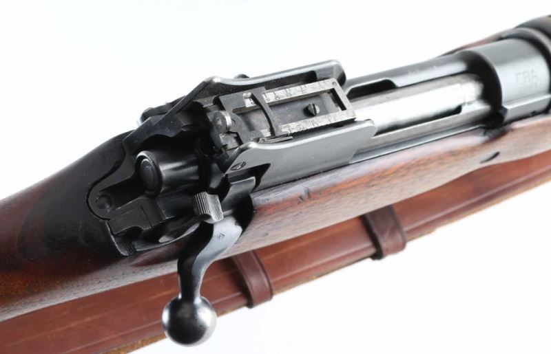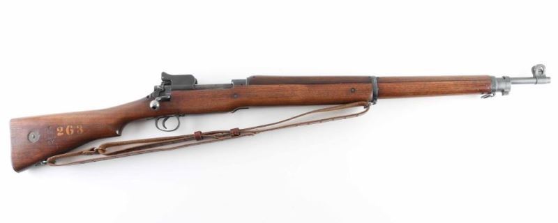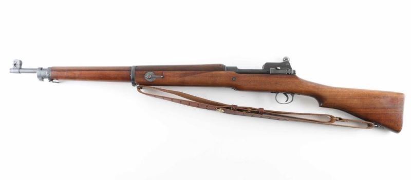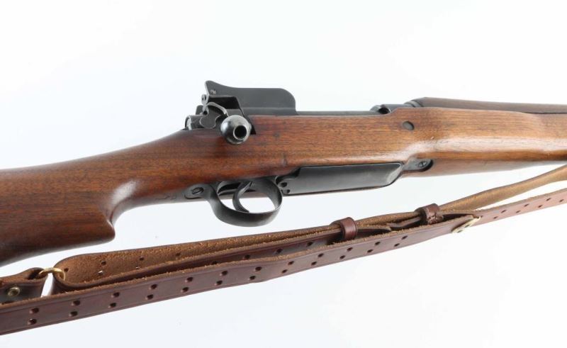 'No 3 Mk 1e' British military magazine fed bolt action service rifle chambered in .303 British. Manufactured in Eddystone, Pennsylvania by the Remington Arms Company of Delaware circa 1914-1916, for use during WWI. Features dog-leg bolt handle, protected blade front sight, folding ladder rear sight with peep apertures, approx 26 inch barrel, manual safety, sling swivels, volley sights, storage compartment in butt, blued finish, wood stock with handguard. Bore is good condition with frosted grooves, strong rifling. Retains 80% finish on metal parts, showing bare metal on sharp edges, where handled, and where moving parts rub. Stock is very good condition, with brass marking disc. Markings include "EY" and crossed keys proof on left side of receiver, "IE" in circle, "PATT 14" and "EY" on right side of butt. Includes very good condition leather sling. Condition is NRA Very Good *** C&R Firearm ***