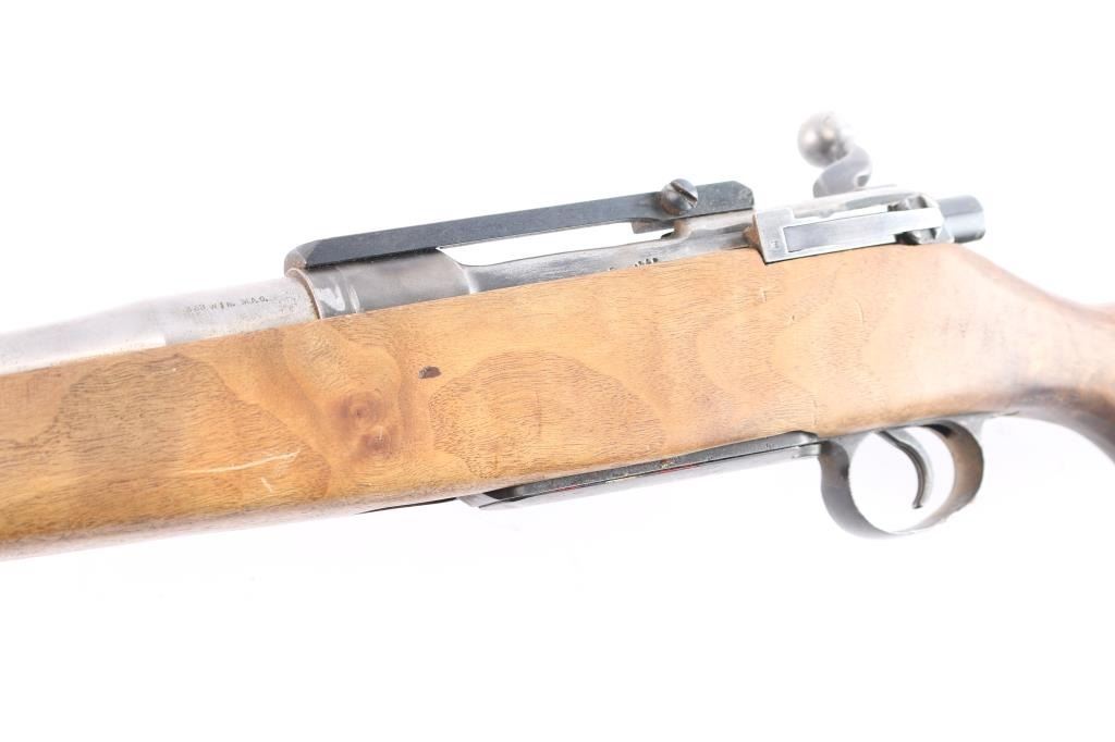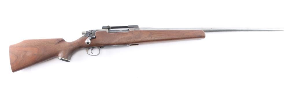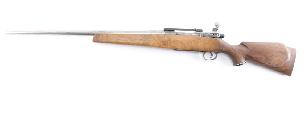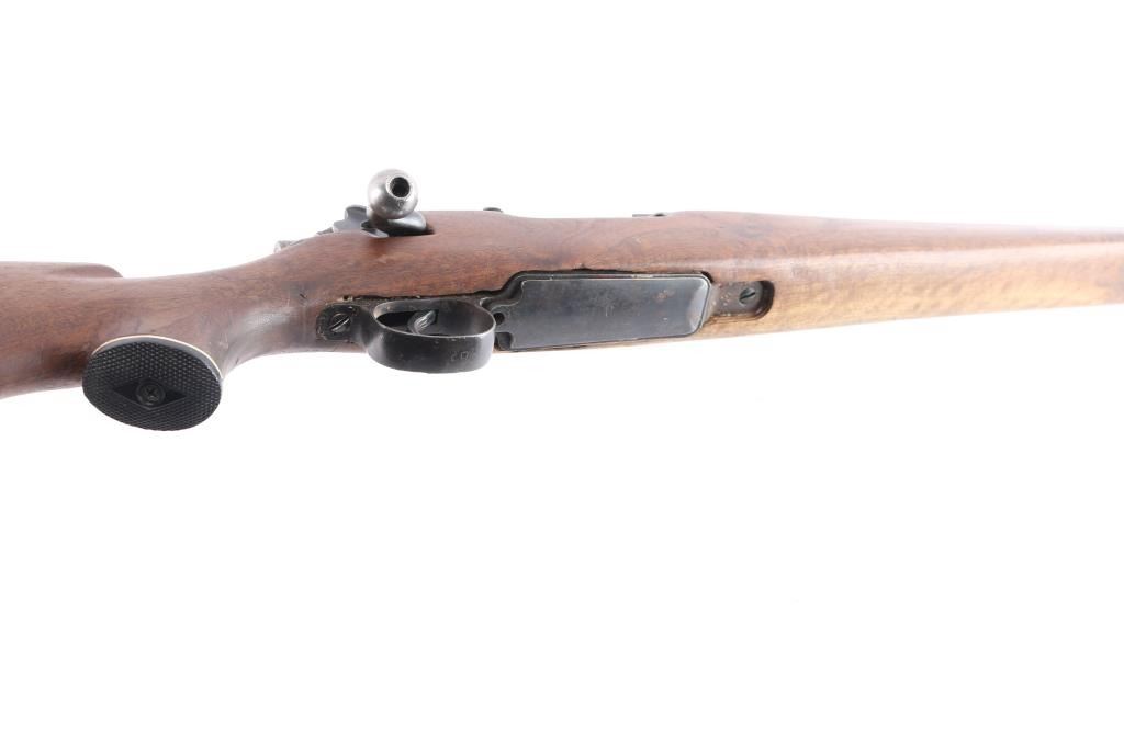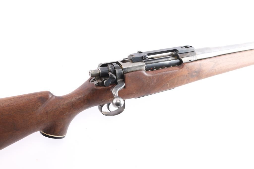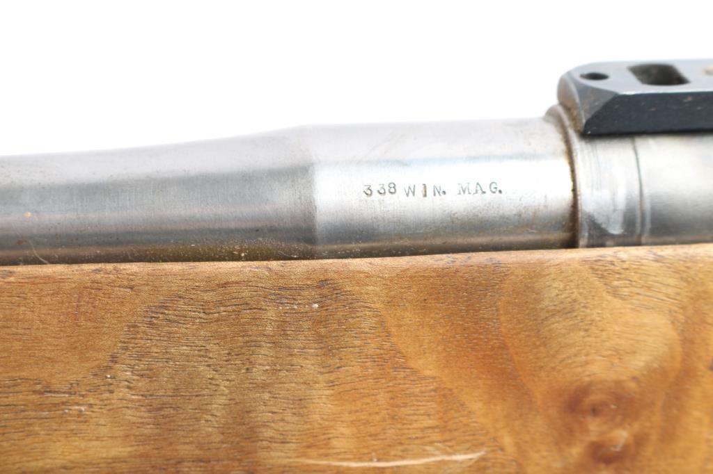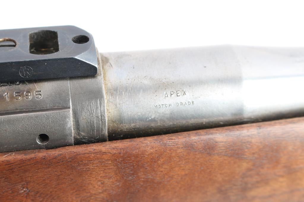 This is a highly sporterized British bolt action rifle. Originally manufactured in Eddystone, Pennsylvania by Remington Arms for use during WWI, this rifle was re-chambered in .338 Winchester Magnum. It features an approximately 24.5" Apex (Marked Match Grade) in-the-white tapered barrel with a recessed crown, a dog-leg style bolt handle, a serrated curved trigger, manual safety, no iron sights, no sling studs or swivels, and a hinged floorplate. The Monte Carlo style stock is in good condition with very minor handling marks, no buttplate, and a checkered grip cap for the semi-pistol grip. The bore looks dark, or dirty, but the rifling looks strong. The original bluing (receiver, trigger guard and floorplate) is approximately 20% with scattered rust throughout. The action seems to be sound, but the magazine parts have been removed rendering this rifle as a single shot tool. This rifle also comes with Redfield mounts.