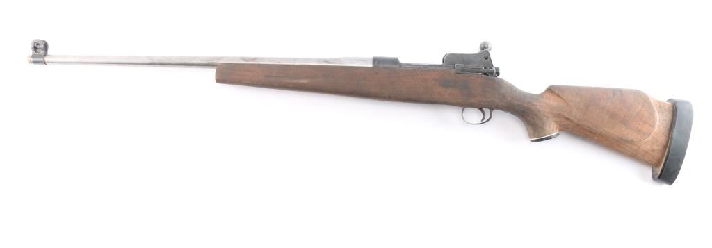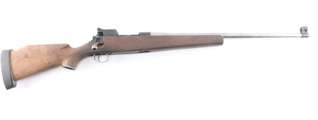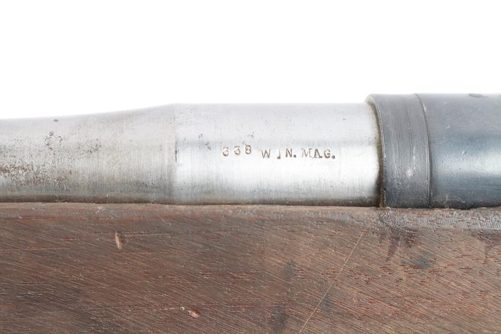 This is a highly sporterized British bolt action rifle which was a 'drill purpose' rifle before it was sporterized. Originally manufactured in Eddystone, Pennsylvania by Remington Arms for use during WWI. This rifle was re-chambered in .338 Winchester Magnum. It features an approximately 24.5" in-the-white tapered barrel with a recessed crown, a dog-leg style bolt handle, a serrated curved trigger, manual safety, stripper clip guides in receiver, protected blade front sight, folding ladder rear sight with peep apertures, and a hinged floorplate. It has a Monte Carlo style stock that is a work in progress and is serviceable, it has an oversized rubber buttpad, and a checkered grip cap for the semi-pistol grip. The bore looks dark, or dirty, but the rifling looks strong. The original bluing (receiver, trigger guard and floorplate) is approximately 85% because the trigger guard is mostly bare. There is scattered light rust on the barrel. The action seems to be sound.