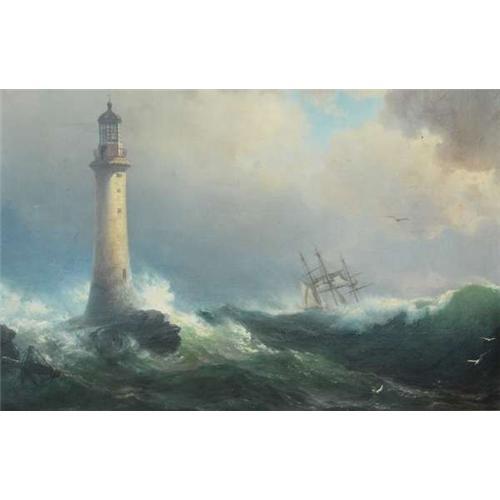 Rough seas with Eddystone lighthouse and ship in the distance, Vilhelm Melbye </em></td>