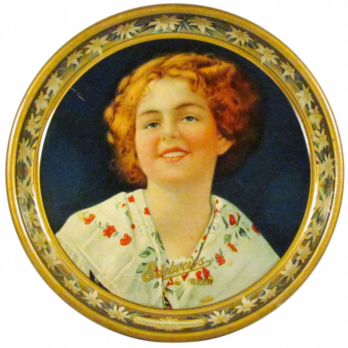 Edelweiss Beer Tin Serving Tray. The Peter Schoenhofen Brewing Co. Chicago. Depicting woman surounded by daffodills. Copyright P.S.B. 1913. Excellent condition. 13 inch diameter.