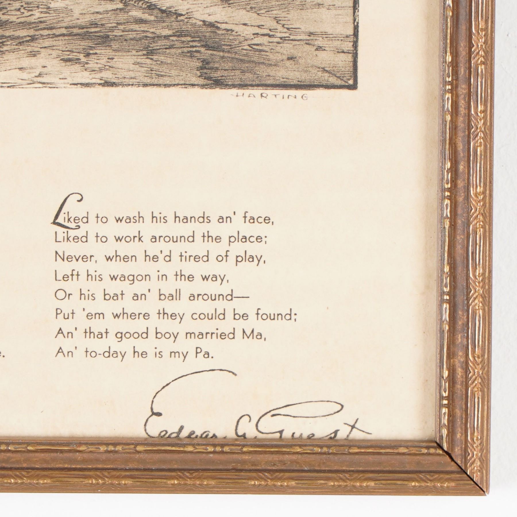 Framed 1931 print titled The Good Little Boy, featuring a poem by beloved American poet Edgar A. Guest with artwork by Harting. Published by Brown & Bigelow, St. Paul, Minn., this sentimental piece reflects Guest's signature moral tone, promoting values of hard work, cleanliness, and obedience. The lithograph includes a detailed sepia-toned illustration of a boy and his home, with the artist's name, Harting, printed below the image. The poem is signed in facsimile by Guest. Presented in a carved wood frame with wire for hanging.
