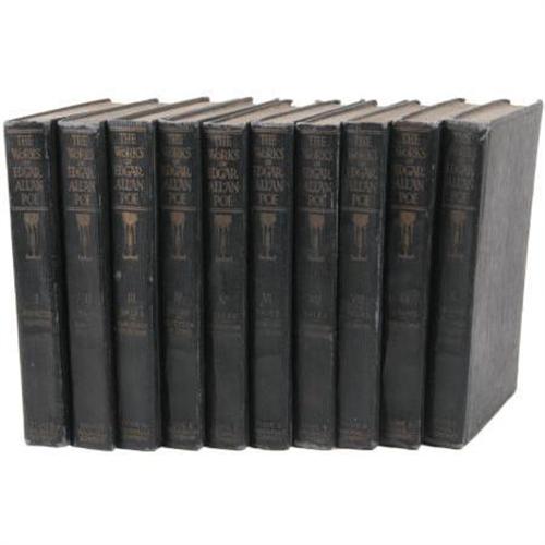 <B>Edgar Allan Poe:<I> The Works of Edgar Allan Poe.</B></I></B></I> (New York: Funk & Wagnalls Company, 1904), in ten volumes, commemorative edition, frontis in each volume, navy blue boards with gilt titles, 16mo (4.25 x 6), light shelf wear, else very good condition. <BR><BR><b>Shipping:</b> Books & Catalogs (<a target="_blank" href="http://www.heritageauctions.com/common/shipping.php">view shipping information</a>)