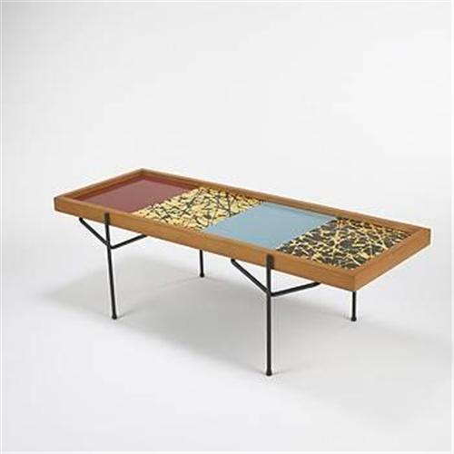 Edgar Bartolucci<BR>modular-top coffee table<BR>USA, 1954<BR>birch, lacquered masonite, iron<BR>48"w x 18.5"d x 15.5"h<BR>An inventive design featuring four removable and reversible panels by Robert Cato with solid colored and abstract patterned designs. <BR><BR><BR><BR><BR><BR>