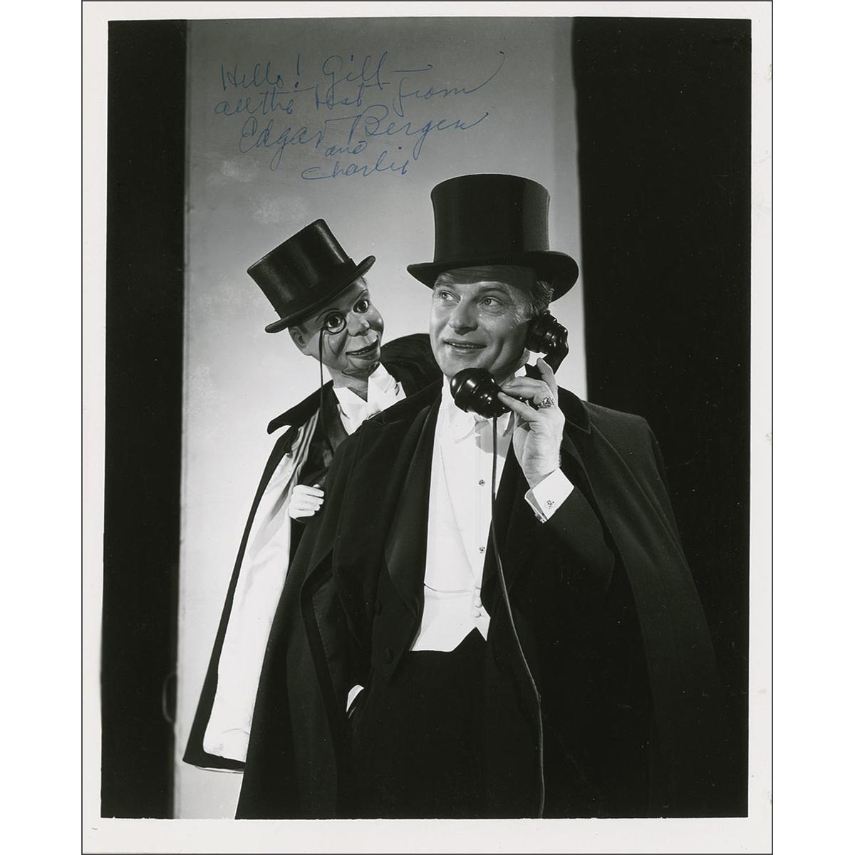 Vintage glossy 8 x 10 photo of Bergen and Charlie McCarthy in matching tuxedoes and capes, signed and inscribed in blue ink “Hello! Gill–all the best from Edgar Bergen and Charlie.” In very good condition, with a noticeable diagonal crease through image, and some scattered light edge dings and creases.