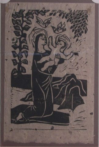 Edgar Britton, Woodblock Edgar Britton, Woodblock, Madonna and child, Two birds flying above their head, 8-1/4" x 6-1/4", Signed E.B. lower right,