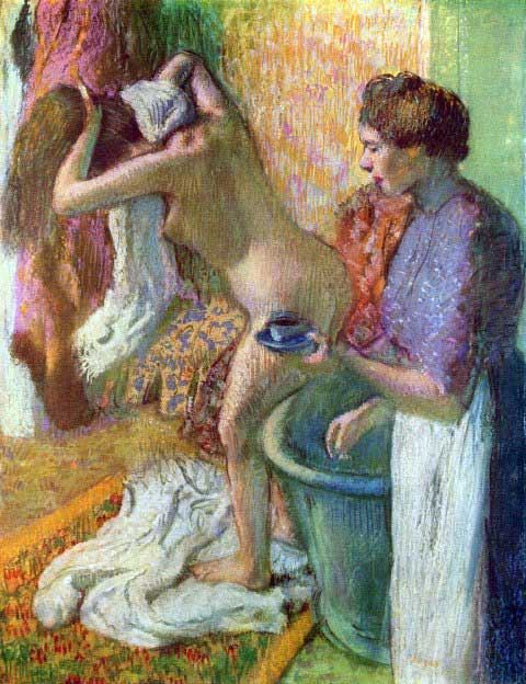 Artist: Degas - Title:After Bathing #1 - Medium: Fine Art Reproduction Giclee on Archival Canvas - Image Size: Approximately 20 inches x 15.25 inches - Framed: Unframed on Unstretched Canvas - Edgar Degas was a French artist famous for his work in painting, sculpture, printmaking and drawing. He is regarded as one of the founders of Impressionism although he rejected the term, and preferred to be called a realist. A superb draftsman, he is especially identified with the subject of the dance, and over half of his works depict dancers. These display his mastery in the depiction of movement, as do his racecourse subjects and female nudes. His portraits are notable for their psychological complexity and depiction of human isolation. - Early in his career, he wanted to be a history painter, a calling for which he was well prepared by his rigorous academic training and close study of classic art. In his early thirties, he changed course, and by bringing the traditional methods of a history painter to bear on contemporary subject matter, he became a classical painter of modern life.