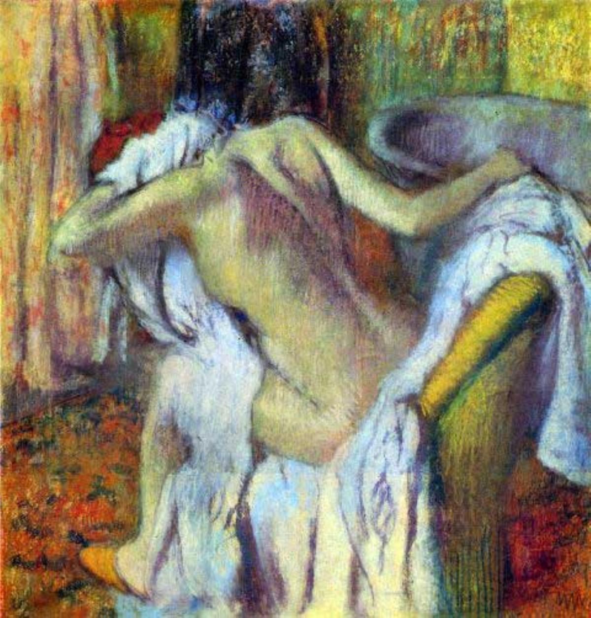 Artist: Degas - Title: After Bathing #4 - Medium: Fine Art Reproduction Giclee on Archival Canvas - Image Size: Approximately 32 inches x 30.5 inches - Framed: Unframed on Unstretched Canvas - Edgar Degas was a French artist famous for his work in painting, sculpture, printmaking and drawing. He is regarded as one of the founders of Impressionism although he rejected the term, and preferred to be called a realist. A superb draftsman, he is especially identified with the subject of the dance, and over half of his works depict dancers. These display his mastery in the depiction of movement, as do his racecourse subjects and female nudes. His portraits are notable for their psychological complexity and depiction of human isolation. - Early in his career, he wanted to be a history painter, a calling for which he was well prepared by his rigorous academic training and close study of classic art. In his early thirties, he changed course, and by bringing the traditional methods of a history painter to bear on contemporary subject matter, he became a classical painter of modern life.
