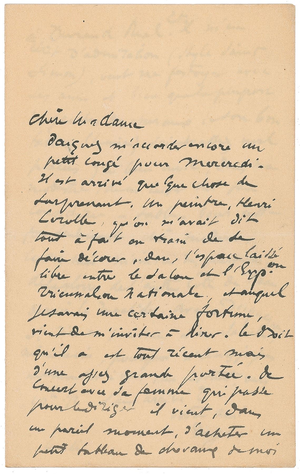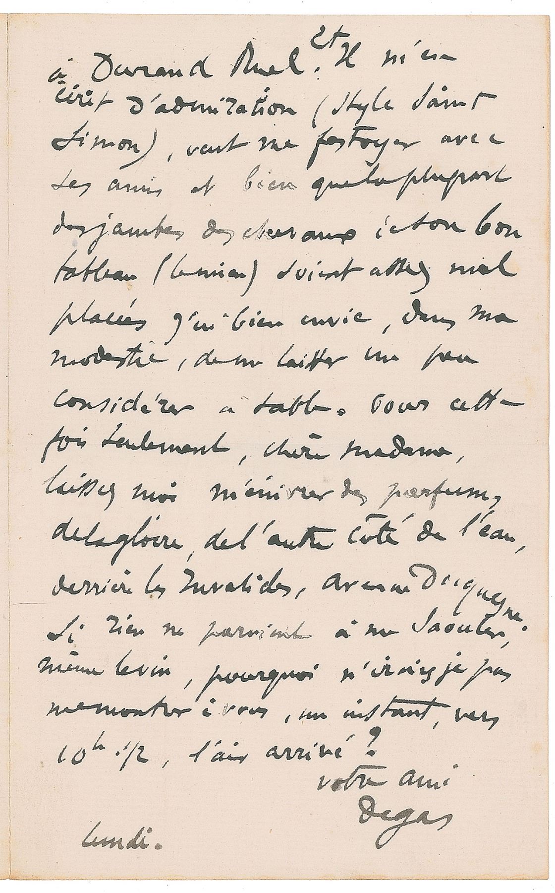 ALS in French, signed “Degas,” two pages on two adjoining sheets, 4.25 x 7, [January 1883]. Letter to Mrs. Albert Bartholome, canceling for Wednesday, because "something surprising" has happened. A wealthy painter, Henry Lerolle, invited him to dinner. Lerolle has just bought "a small painting of horses by me at Durand-Ruel [Before the Race] and he has written to me in admiration (Saint-Simon style), wants to feast me with his friends and although most of the legs of the horses in his good painting (mine) are rather badly placed, I have a good mind, in my modesty, to let myself be considered a little at the table. Just this once, dear Madam, let me get drunk with the perfumes of glory, on the other side of the water, behind the Invalides." Degas playfully notes, "if nothing manages to get me drunk, even the wine," he will come to see her at the end of the evening. In fine condition, with splitting to the bottom of the hinge.