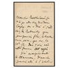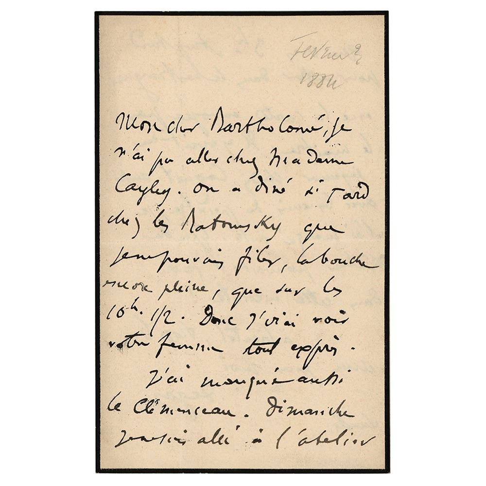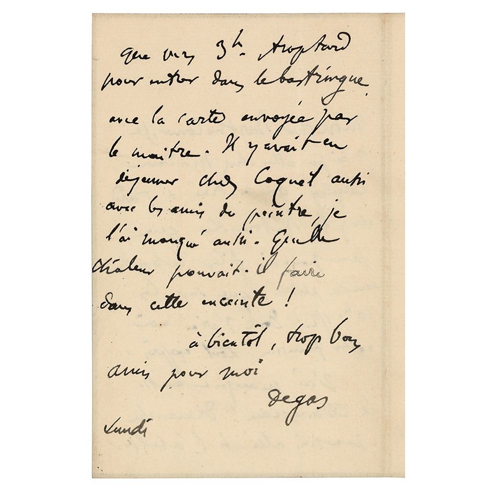 ALS in French, signed “Degas,†one page both sides, 4.5 x 7, [February 3, 1884, dated in another hand]. Handwritten letter to the sculptor Albert Bartholomé, in full: "I couldn’t go to Mrs. Kaley because we had dinner so late at the house of the Ratowsky that I could not leave my mouth till full only at about 10:30. So I will go and see your wife expressly. I also missed Clemenceau on Sunday I went to the Atelier. I could only go to the Atelier around 3. Too late to be authorized to enter with the cards that were sent by the master. There had been a luncheon with Coquet also with the friends of the painter and I also missed it. What an incredible heat within that place. See you later. You are too good a friend to me." In fine condition.