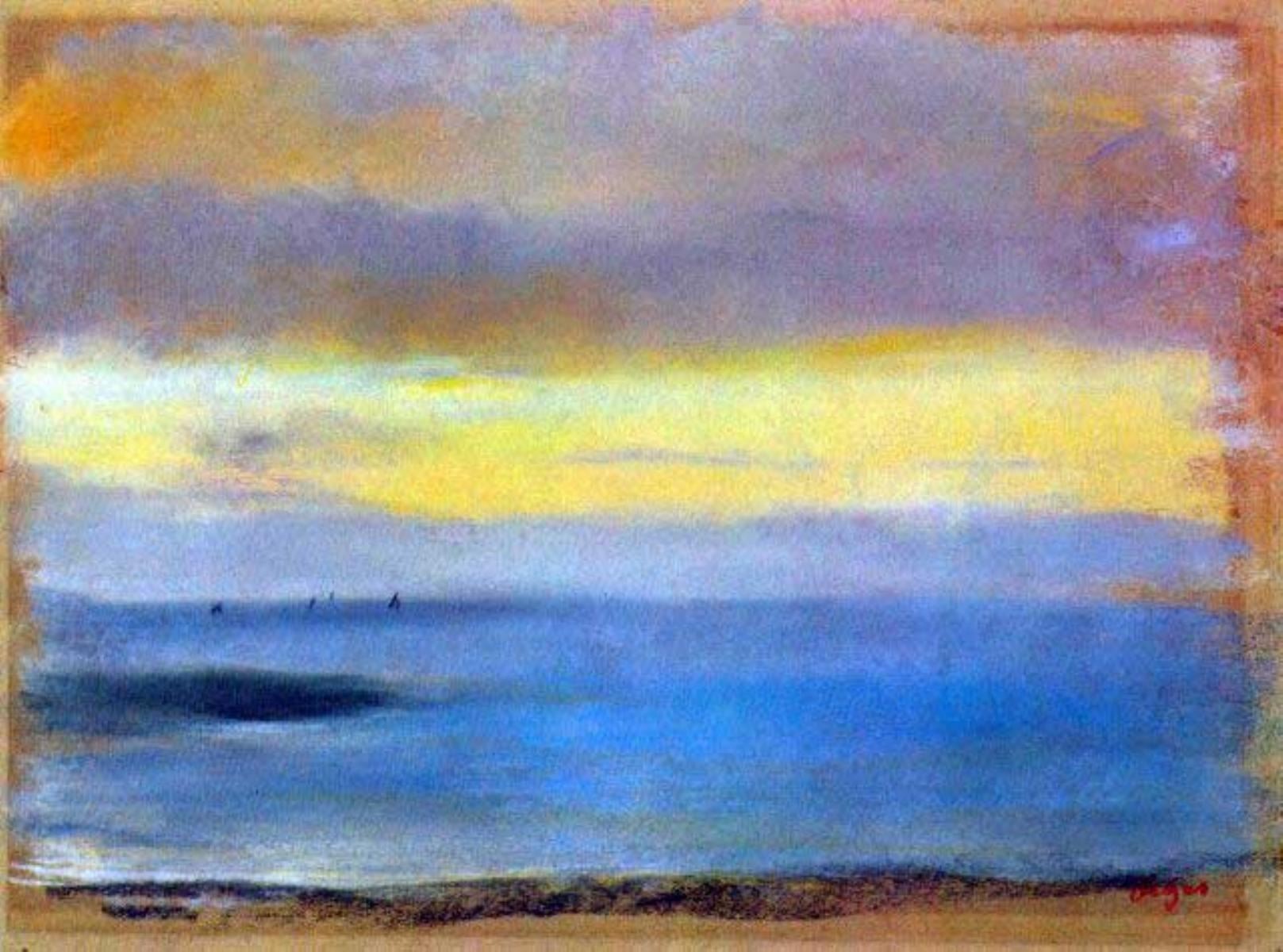 Artist: Degas - Title: Coastal Strip at Sunset - Medium: Fine Art Reproduction Giclee on Archival Canvas - Image Size: Approximately 23.75 inches x 32 inches - Framed: Unframed on Unstretched Canvas - Edgar Degas was a French artist famous for his work in painting, sculpture, printmaking and drawing. He is regarded as one of the founders of Impressionism although he rejected the term, and preferred to be called a realist. A superb draftsman, he is especially identified with the subject of the dance, and over half of his works depict dancers. These display his mastery in the depiction of movement, as do his racecourse subjects and female nudes. His portraits are notable for their psychological complexity and depiction of human isolation. - Early in his career, he wanted to be a history painter, a calling for which he was well prepared by his rigorous academic training and close study of classic art. In his early thirties, he changed course, and by bringing the traditional methods of a history painter to bear on contemporary subject matter, he became a classical painter of modern life.