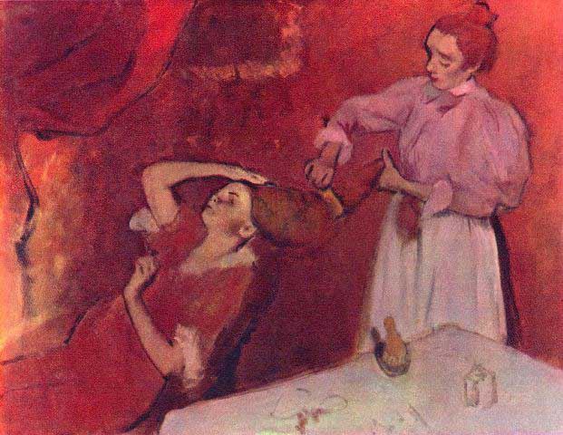 Artist: Degas - Title: Combing Hair - Medium: Fine Art Reproduction Giclee on Archival Canvas - Image Size: Approximately 15.5 inches x 20 inches - Framed: Unframed on Unstretched Canvas - Edgar Degas was a French artist famous for his work in painting, sculpture, printmaking and drawing. He is regarded as one of the founders of Impressionism although he rejected the term, and preferred to be called a realist. A superb draftsman, he is especially identified with the subject of the dance, and over half of his works depict dancers. These display his mastery in the depiction of movement, as do his racecourse subjects and female nudes. His portraits are notable for their psychological complexity and depiction of human isolation. - Early in his career, he wanted to be a history painter, a calling for which he was well prepared by his rigorous academic training and close study of classic art. In his early thirties, he changed course, and by bringing the traditional methods of a history painter to bear on contemporary subject matter, he became a classical painter of modern life.