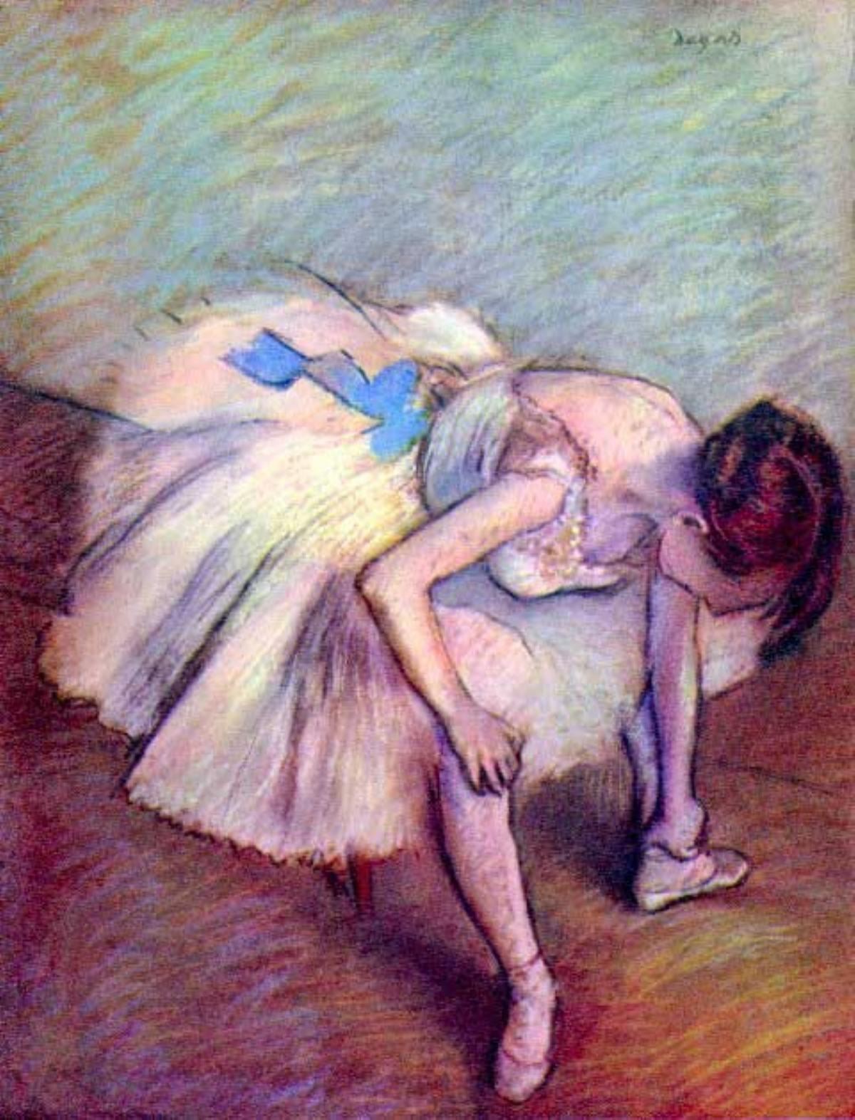 Artist: Degas - Title: Dancer Bent Over - Medium: Fine Art Reproduction Giclee on Archival Canvas - Image Size: Approximately 32 inches x 24.5 inches - Framed: Unframed on Unstretched Canvas - Edgar Degas was a French artist famous for his work in painting, sculpture, printmaking and drawing. He is regarded as one of the founders of Impressionism although he rejected the term, and preferred to be called a realist. A superb draftsman, he is especially identified with the subject of the dance, and over half of his works depict dancers. These display his mastery in the depiction of movement, as do his racecourse subjects and female nudes. His portraits are notable for their psychological complexity and depiction of human isolation. - Early in his career, he wanted to be a history painter, a calling for which he was well prepared by his rigorous academic training and close study of classic art. In his early thirties, he changed course, and by bringing the traditional methods of a history painter to bear on contemporary subject matter, he became a classical painter of modern life.