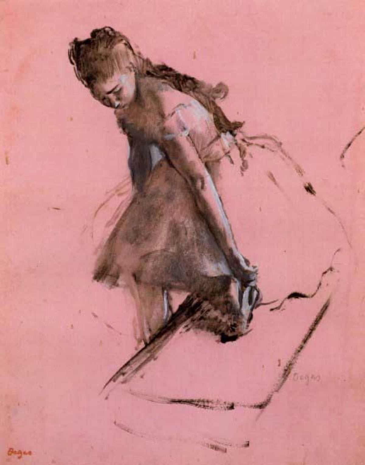 Artist: Degas - Title: Dancer Slipping On Her Shoe - Medium: Fine Art Reproduction Giclee on Archival Canvas - Image Size: Approximately 20 inches x 15.75 inches - Framed: Unframed on Unstretched Canvas - Edgar Degas was a French artist famous for his work in painting, sculpture, printmaking and drawing. He is regarded as one of the founders of Impressionism although he rejected the term, and preferred to be called a realist. A superb draftsman, he is especially identified with the subject of the dance, and over half of his works depict dancers. These display his mastery in the depiction of movement, as do his racecourse subjects and female nudes. His portraits are notable for their psychological complexity and depiction of human isolation. - Early in his career, he wanted to be a history painter, a calling for which he was well prepared by his rigorous academic training and close study of classic art. In his early thirties, he changed course, and by bringing the traditional methods of a history painter to bear on contemporary subject matter, he became a classical painter of modern life.
