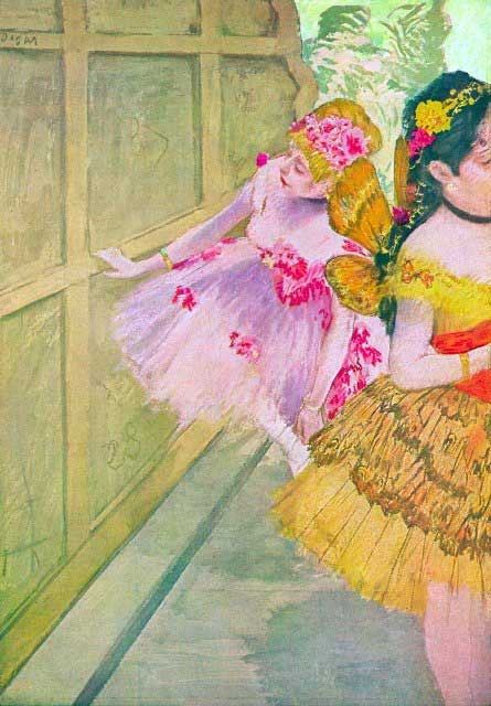 Artist: Degas - Title: Dancers Behind A Backdrop - Medium: Fine Art Reproduction Giclee on Archival Canvas - Image Size: Approximately 20 inches x 14 inches - Framed: Unframed on Unstretched Canvas - Edgar Degas was a French artist famous for his work in painting, sculpture, printmaking and drawing. He is regarded as one of the founders of Impressionism although he rejected the term, and preferred to be called a realist. A superb draftsman, he is especially identified with the subject of the dance, and over half of his works depict dancers. These display his mastery in the depiction of movement, as do his racecourse subjects and female nudes. His portraits are notable for their psychological complexity and depiction of human isolation. - Early in his career, he wanted to be a history painter, a calling for which he was well prepared by his rigorous academic training and close study of classic art. In his early thirties, he changed course, and by bringing the traditional methods of a history painter to bear on contemporary subject matter, he became a classical painter of modern life.