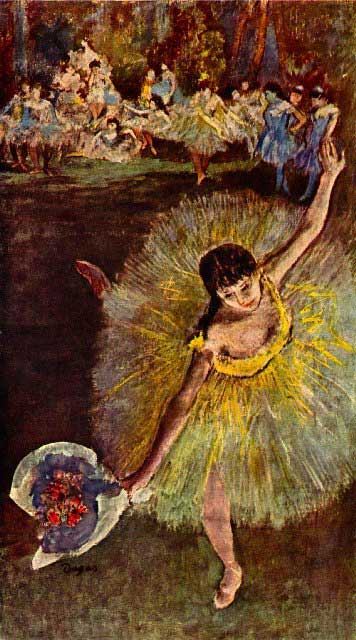 Artist: Degas - Title: End Of The Arabesque - Medium: Fine Art Reproduction Giclee on Archival Canvas - Image Size: Approximately 20 inches x 11 inches - Framed: Unframed on Unstretched Canvas - Edgar Degas was a French artist famous for his work in painting, sculpture, printmaking and drawing. He is regarded as one of the founders of Impressionism although he rejected the term, and preferred to be called a realist. A superb draftsman, he is especially identified with the subject of the dance, and over half of his works depict dancers. These display his mastery in the depiction of movement, as do his racecourse subjects and female nudes. His portraits are notable for their psychological complexity and depiction of human isolation. - Early in his career, he wanted to be a history painter, a calling for which he was well prepared by his rigorous academic training and close study of classic art. In his early thirties, he changed course, and by bringing the traditional methods of a history painter to bear on contemporary subject matter, he became a classical painter of modern life.