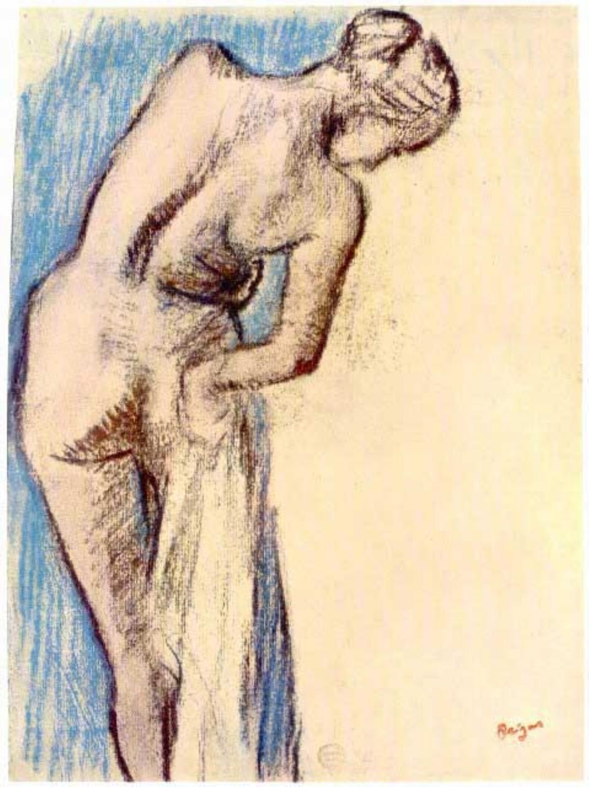 Artist: Degas - Title: Female After The Bath - Medium: Fine Art Reproduction Giclee on Archival Canvas - Image Size: Approximately 32 inches x 24 inches - Framed: Unframed on Unstretched Canvas - Edgar Degas was a French artist famous for his work in painting, sculpture, printmaking and drawing. He is regarded as one of the founders of Impressionism although he rejected the term, and preferred to be called a realist. A superb draftsman, he is especially identified with the subject of the dance, and over half of his works depict dancers. These display his mastery in the depiction of movement, as do his racecourse subjects and female nudes. His portraits are notable for their psychological complexity and depiction of human isolation. - Early in his career, he wanted to be a history painter, a calling for which he was well prepared by his rigorous academic training and close study of classic art. In his early thirties, he changed course, and by bringing the traditional methods of a history painter to bear on contemporary subject matter, he became a classical painter of modern life.
