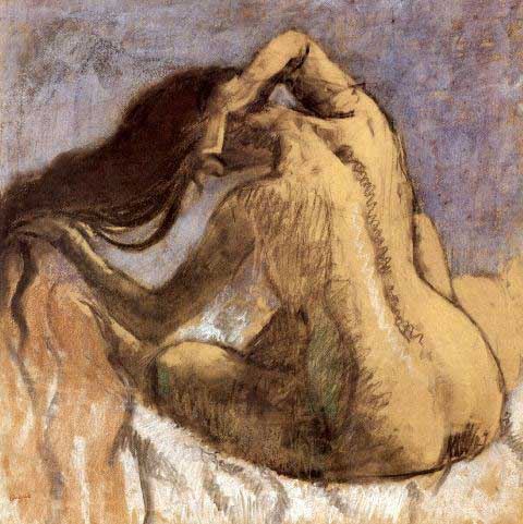 Artist: Degas - Title: Female Combing Hair - Medium: Fine Art Reproduction Giclee on Archival Canvas - Image Size: Approximately 32 inches x 32 inches - Framed: Unframed on Unstretched Canvas - Edgar Degas was a French artist famous for his work in painting, sculpture, printmaking and drawing. He is regarded as one of the founders of Impressionism although he rejected the term, and preferred to be called a realist. A superb draftsman, he is especially identified with the subject of the dance, and over half of his works depict dancers. These display his mastery in the depiction of movement, as do his racecourse subjects and female nudes. His portraits are notable for their psychological complexity and depiction of human isolation. - Early in his career, he wanted to be a history painter, a calling for which he was well prepared by his rigorous academic training and close study of classic art. In his early thirties, he changed course, and by bringing the traditional methods of a history painter to bear on contemporary subject matter, he became a classical painter of modern life.