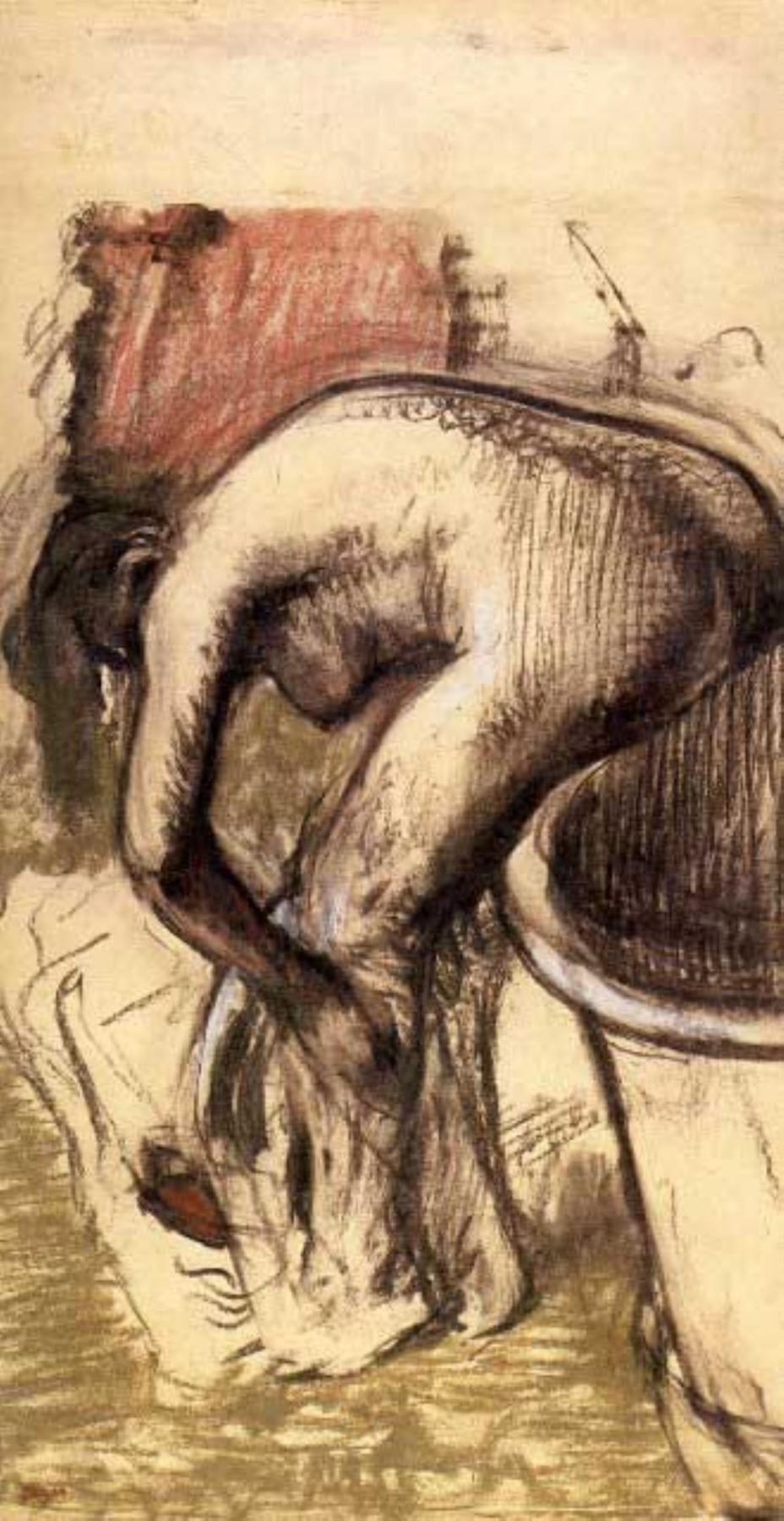 Artist: Degas - Title: Female On The Tub Edge, Her Legs Drying #1 - Medium: Fine Art Reproduction Giclee on Archival Canvas - Image Size: Approximately 32 inches x 16.5 inches - Framed: Unframed on Unstretched Canvas - Edgar Degas was a French artist famous for his work in painting, sculpture, printmaking and drawing. He is regarded as one of the founders of Impressionism although he rejected the term, and preferred to be called a realist. A superb draftsman, he is especially identified with the subject of the dance, and over half of his works depict dancers. These display his mastery in the depiction of movement, as do his racecourse subjects and female nudes. His portraits are notable for their psychological complexity and depiction of human isolation. - Early in his career, he wanted to be a history painter, a calling for which he was well prepared by his rigorous academic training and close study of classic art. In his early thirties, he changed course, and by bringing the traditional methods of a history painter to bear on contemporary subject matter, he became a classical painter of modern life.