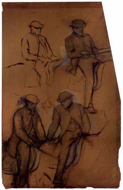 Artist: Degas - Title: Four Riders - A Study - Medium: Fine Art Reproduction Giclee on Archival Canvas - Image Size: Approximately 20 inches x 13 inches - Framed: Unframed on Unstretched Canvas - Edgar Degas was a French artist famous for his work in painting, sculpture, printmaking and drawing. He is regarded as one of the founders of Impressionism although he rejected the term, and preferred to be called a realist. A superb draftsman, he is especially identified with the subject of the dance, and over half of his works depict dancers. These display his mastery in the depiction of movement, as do his racecourse subjects and female nudes. His portraits are notable for their psychological complexity and depiction of human isolation. - Early in his career, he wanted to be a history painter, a calling for which he was well prepared by his rigorous academic training and close study of classic art. In his early thirties, he changed course, and by bringing the traditional methods of a history painter to bear on contemporary subject matter, he became a classical painter of modern life.