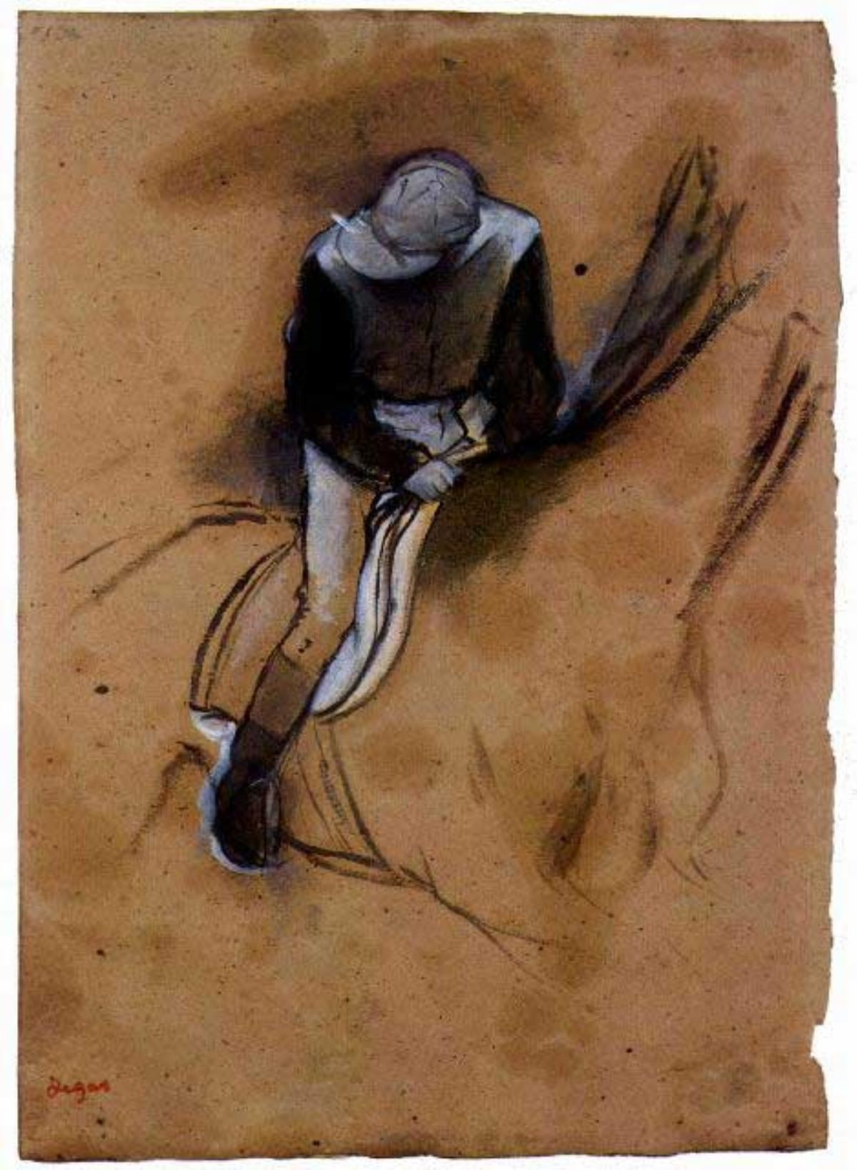 Artist: Degas - Title:Jockey Forward Flexed Standing In The Saddle - Medium: Fine Art Reproduction Giclee on Archival Canvas - Image Size: Approximately 20 inches x 14.75 inches - Framed: Unframed on Unstretched Canvas - Edgar Degas was a French artist famous for his work in painting, sculpture, printmaking and drawing. He is regarded as one of the founders of Impressionism although he rejected the term, and preferred to be called a realist. A superb draftsman, he is especially identified with the subject of the dance, and over half of his works depict dancers. These display his mastery in the depiction of movement, as do his racecourse subjects and female nudes. His portraits are notable for their psychological complexity and depiction of human isolation. - Early in his career, he wanted to be a history painter, a calling for which he was well prepared by his rigorous academic training and close study of classic art. In his early thirties, he changed course, and by bringing the traditional methods of a history painter to bear on contemporary subject matter, he became a classical painter of modern life.