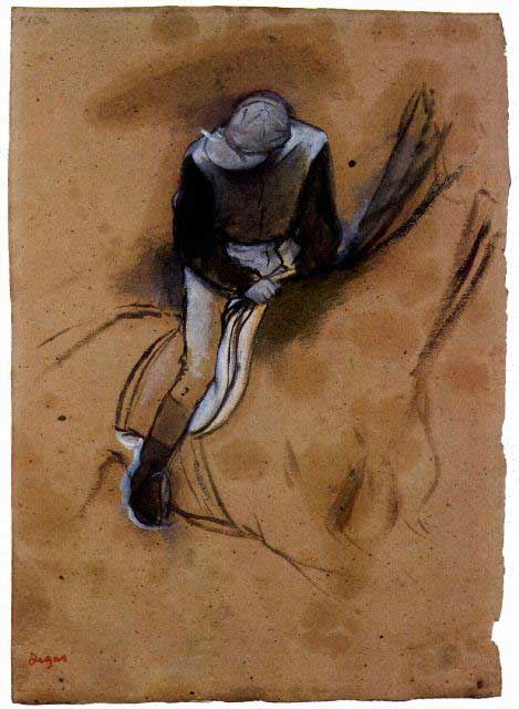 Artist: Degas - Title:Jockey Forward Flexed Standing In The Saddle - Medium: Fine Art Reproduction Giclee on Archival Canvas - Image Size: Approximately 20 inches x 14.75 inches - Framed: Unframed on Unstretched Canvas - Edgar Degas was a French artist famous for his work in painting, sculpture, printmaking and drawing. He is regarded as one of the founders of Impressionism although he rejected the term, and preferred to be called a realist. A superb draftsman, he is especially identified with the subject of the dance, and over half of his works depict dancers. These display his mastery in the depiction of movement, as do his racecourse subjects and female nudes. His portraits are notable for their psychological complexity and depiction of human isolation. - Early in his career, he wanted to be a history painter, a calling for which he was well prepared by his rigorous academic training and close study of classic art. In his early thirties, he changed course, and by bringing the traditional methods of a history painter to bear on contemporary subject matter, he became a classical painter of modern life.