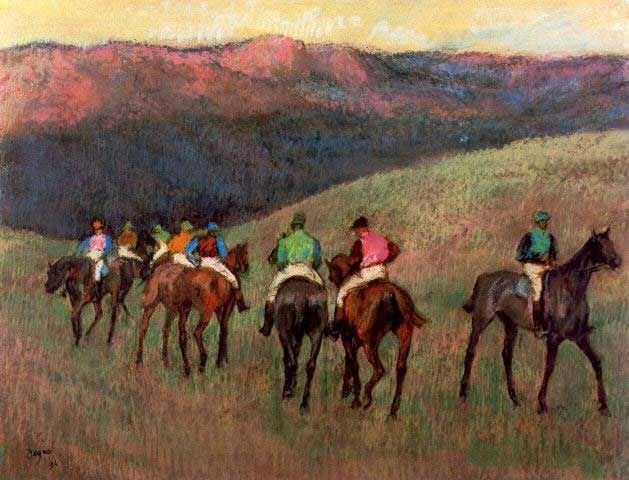 Artist: Degas - Title: Jockeys In Training - Medium: Fine Art Reproduction Giclee on Archival Canvas - Image Size: Approximately 15.25 inches x 20 inches - Framed: Unframed on Unstretched Canvas - Edgar Degas was a French artist famous for his work in painting, sculpture, printmaking and drawing. He is regarded as one of the founders of Impressionism although he rejected the term, and preferred to be called a realist. A superb draftsman, he is especially identified with the subject of the dance, and over half of his works depict dancers. These display his mastery in the depiction of movement, as do his racecourse subjects and female nudes. His portraits are notable for their psychological complexity and depiction of human isolation. - Early in his career, he wanted to be a history painter, a calling for which he was well prepared by his rigorous academic training and close study of classic art. In his early thirties, he changed course, and by bringing the traditional methods of a history painter to bear on contemporary subject matter, he became a classical painter of modern life.