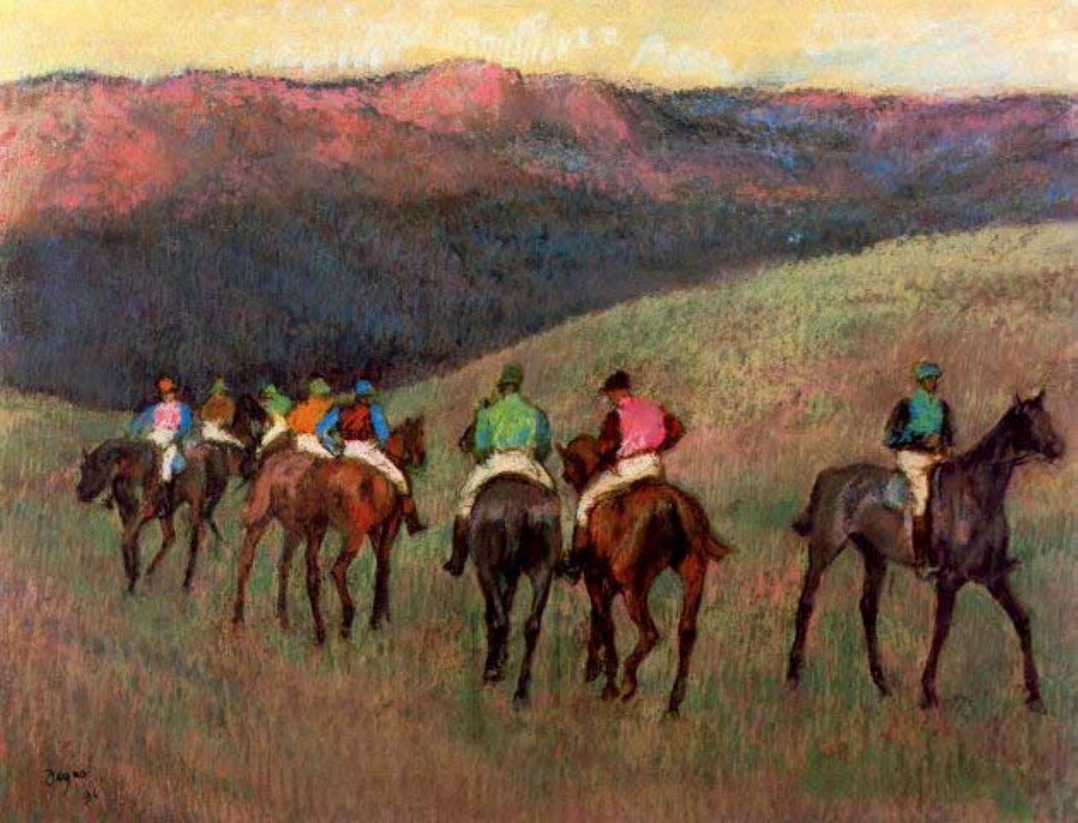 Artist: Degas - Title: Jockeys In Training - Medium: Fine Art Reproduction Giclee on Archival Canvas - Image Size: Approximately 24.5 inches x 32 inches - Framed: Unframed on Unstretched Canvas - Edgar Degas was a French artist famous for his work in painting, sculpture, printmaking and drawing. He is regarded as one of the founders of Impressionism although he rejected the term, and preferred to be called a realist. A superb draftsman, he is especially identified with the subject of the dance, and over half of his works depict dancers. These display his mastery in the depiction of movement, as do his racecourse subjects and female nudes. His portraits are notable for their psychological complexity and depiction of human isolation. - Early in his career, he wanted to be a history painter, a calling for which he was well prepared by his rigorous academic training and close study of classic art. In his early thirties, he changed course, and by bringing the traditional methods of a history painter to bear on contemporary subject matter, he became a classical painter of modern life.