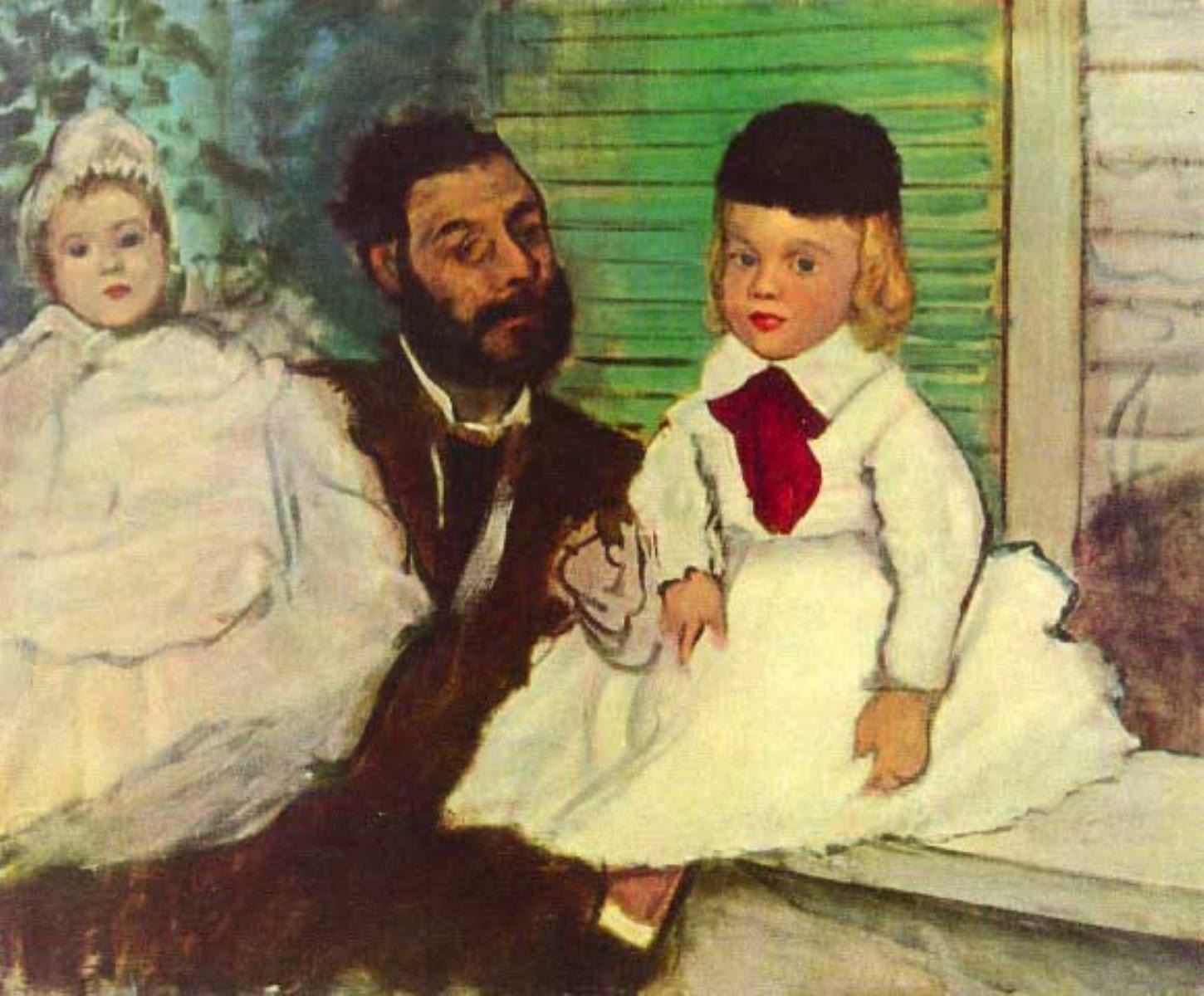 Artist: Degas - Title: Portrait Of Count Lepic And His Daughters - Medium: Fine Art Reproduction Giclee on Archival Canvas - Image Size: Approximately 16.5 inches x 20 inches - Framed: Unframed on Unstretched Canvas - Edgar Degas was a French artist famous for his work in painting, sculpture, printmaking and drawing. He is regarded as one of the founders of Impressionism although he rejected the term, and preferred to be called a realist. A superb draftsman, he is especially identified with the subject of the dance, and over half of his works depict dancers. These display his mastery in the depiction of movement, as do his racecourse subjects and female nudes. His portraits are notable for their psychological complexity and depiction of human isolation. - Early in his career, he wanted to be a history painter, a calling for which he was well prepared by his rigorous academic training and close study of classic art. In his early thirties, he changed course, and by bringing the traditional methods of a history painter to bear on contemporary subject matter, he became a classical painter of modern life.