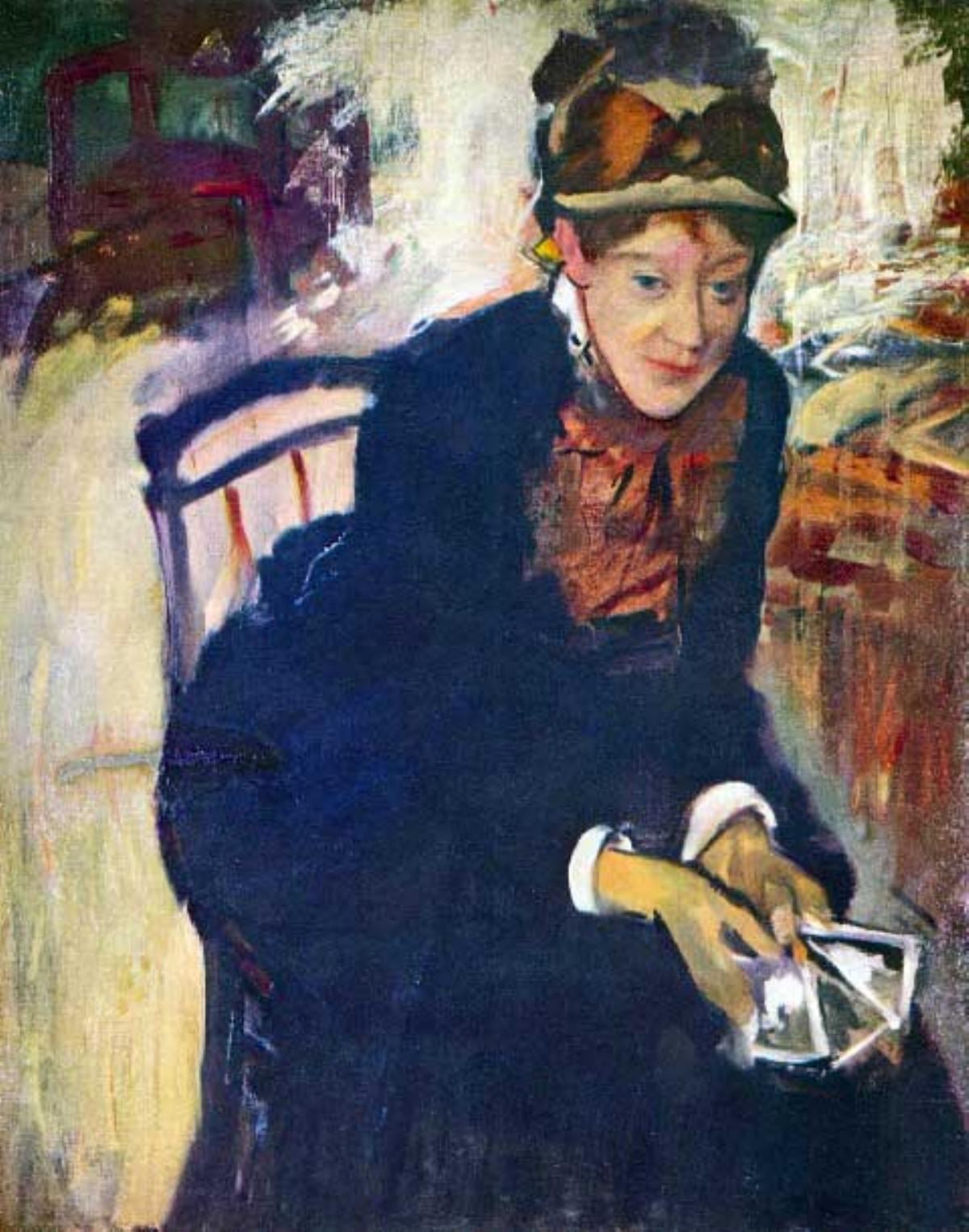Artist: Degas - Title: Portrait Of Miss Cassatt, Holding The Cards - Medium: Fine Art Reproduction Giclee on Archival Canvas - Image Size: Approximately 32 inches x 25.25 inches - Framed: Unframed on Unstretched Canvas - Edgar Degas was a French artist famous for his work in painting, sculpture, printmaking and drawing. He is regarded as one of the founders of Impressionism although he rejected the term, and preferred to be called a realist. A superb draftsman, he is especially identified with the subject of the dance, and over half of his works depict dancers. These display his mastery in the depiction of movement, as do his racecourse subjects and female nudes. His portraits are notable for their psychological complexity and depiction of human isolation. - Early in his career, he wanted to be a history painter, a calling for which he was well prepared by his rigorous academic training and close study of classic art. In his early thirties, he changed course, and by bringing the traditional methods of a history painter to bear on contemporary subject matter, he became a classical painter of modern life.