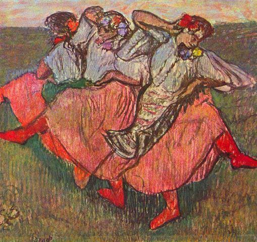 Artist: Degas - Title: Russian Dancers - Medium: Fine Art Reproduction Giclee on Archival Canvas - Image Size: Approximately 30.25 inches x 32 inches - Framed: Unframed on Unstretched Canvas - Edgar Degas was a French artist famous for his work in painting, sculpture, printmaking and drawing. He is regarded as one of the founders of Impressionism although he rejected the term, and preferred to be called a realist. A superb draftsman, he is especially identified with the subject of the dance, and over half of his works depict dancers. These display his mastery in the depiction of movement, as do his racecourse subjects and female nudes. His portraits are notable for their psychological complexity and depiction of human isolation. - Early in his career, he wanted to be a history painter, a calling for which he was well prepared by his rigorous academic training and close study of classic art. In his early thirties, he changed course, and by bringing the traditional methods of a history painter to bear on contemporary subject matter, he became a classical painter of modern life.