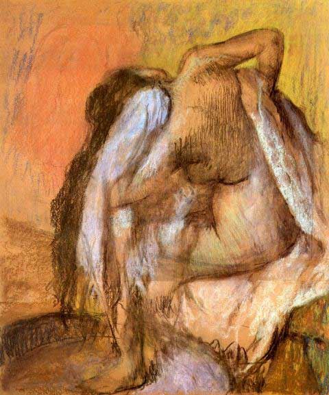 Artist: Degas - Title: Seated Female Nude Drying Neck And Back - Medium: Fine Art Reproduction Giclee on Archival Canvas - Image Size: Approximately 20 inches x 16.75 inches - Framed: Unframed on Unstretched Canvas - Edgar Degas was a French artist famous for his work in painting, sculpture, printmaking and drawing. He is regarded as one of the founders of Impressionism although he rejected the term, and preferred to be called a realist. A superb draftsman, he is especially identified with the subject of the dance, and over half of his works depict dancers. These display his mastery in the depiction of movement, as do his racecourse subjects and female nudes. His portraits are notable for their psychological complexity and depiction of human isolation. - Early in his career, he wanted to be a history painter, a calling for which he was well prepared by his rigorous academic training and close study of classic art. In his early thirties, he changed course, and by bringing the traditional methods of a history painter to bear on contemporary subject matter, he became a classical painter of modern life.