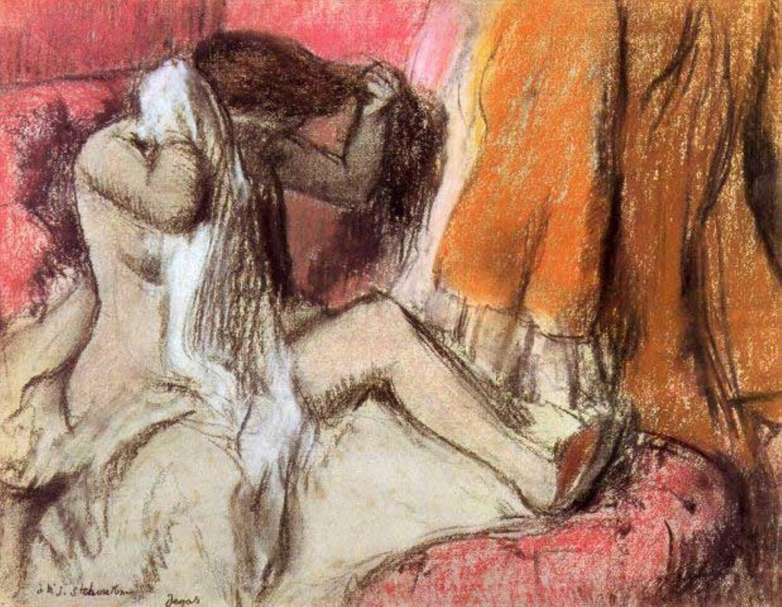 Artist: Degas - Title: Seated Female Nude On A Chaise Lounge - Medium: Fine Art Reproduction Giclee on Archival Canvas - Image Size: Approximately 15.5 inches x 20 inches - Framed: Unframed on Unstretched Canvas - Edgar Degas was a French artist famous for his work in painting, sculpture, printmaking and drawing. He is regarded as one of the founders of Impressionism although he rejected the term, and preferred to be called a realist. A superb draftsman, he is especially identified with the subject of the dance, and over half of his works depict dancers. These display his mastery in the depiction of movement, as do his racecourse subjects and female nudes. His portraits are notable for their psychological complexity and depiction of human isolation. - Early in his career, he wanted to be a history painter, a calling for which he was well prepared by his rigorous academic training and close study of classic art. In his early thirties, he changed course, and by bringing the traditional methods of a history painter to bear on contemporary subject matter, he became a classical painter of modern life.