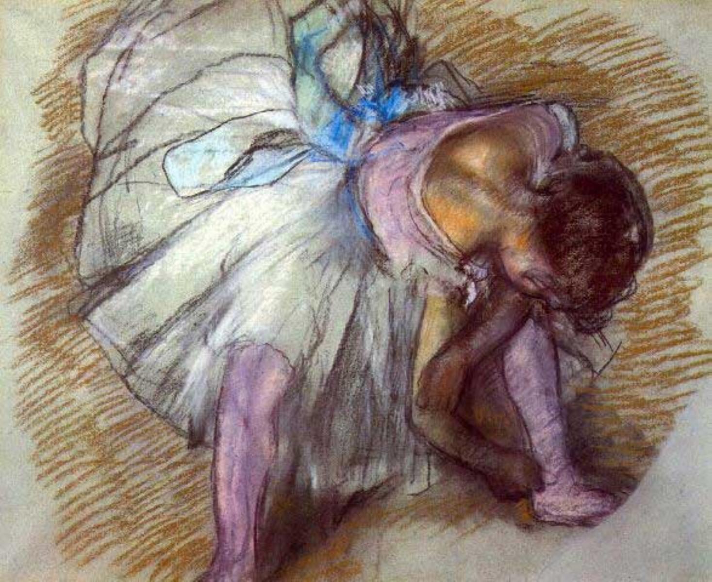 Artist: Degas - Title: Sitting Dancer Lacing Her Slipper - Medium: Fine Art Reproduction Giclee on Archival Canvas - Image Size: Approximately 26.25 inches x 32 inches - Framed: Unframed on Unstretched Canvas - Edgar Degas was a French artist famous for his work in painting, sculpture, printmaking and drawing. He is regarded as one of the founders of Impressionism although he rejected the term, and preferred to be called a realist. A superb draftsman, he is especially identified with the subject of the dance, and over half of his works depict dancers. These display his mastery in the depiction of movement, as do his racecourse subjects and female nudes. His portraits are notable for their psychological complexity and depiction of human isolation. - Early in his career, he wanted to be a history painter, a calling for which he was well prepared by his rigorous academic training and close study of classic art. In his early thirties, he changed course, and by bringing the traditional methods of a history painter to bear on contemporary subject matter, he became a classical painter of modern life.