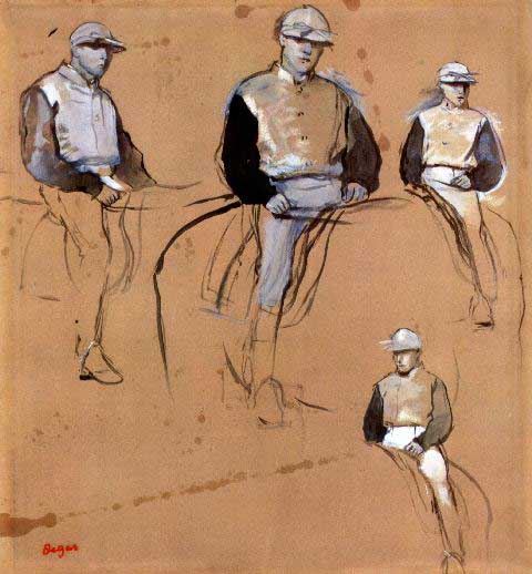Artist: Degas - Title: Study With Four Jockeys - Medium: Fine Art Reproduction Giclee on Archival Canvas - Image Size: Approximately 32 inches x 29.75 inches - Framed: Unframed on Unstretched Canvas - Edgar Degas was a French artist famous for his work in painting, sculpture, printmaking and drawing. He is regarded as one of the founders of Impressionism although he rejected the term, and preferred to be called a realist. A superb draftsman, he is especially identified with the subject of the dance, and over half of his works depict dancers. These display his mastery in the depiction of movement, as do his racecourse subjects and female nudes. His portraits are notable for their psychological complexity and depiction of human isolation. - Early in his career, he wanted to be a history painter, a calling for which he was well prepared by his rigorous academic training and close study of classic art. In his early thirties, he changed course, and by bringing the traditional methods of a history painter to bear on contemporary subject matter, he became a classical painter of modern life.